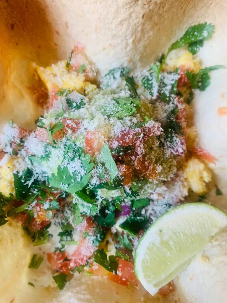 Un burrito viendra s’inviter à la table: avocat, fromage, tomates ceris, oeuf poché et risotto feront partie de la galette.