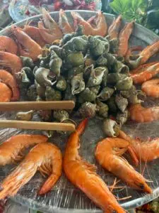 Côté salé, vous choisirez parmi la viande ou le poisson (fruits de mer inclus). Si vous aimez les huitres, vous pourrez les déguster à l’entrée. Une boisson chaude et un jus vous sont offerts à table.