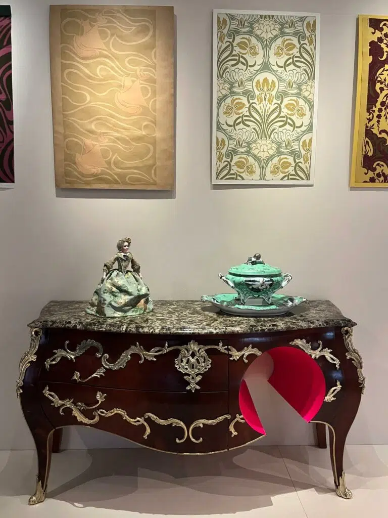 L’exposition se distingue par sa diversité, mêlant des créations de figures emblématiques telles que Louis Majorelle et Jean Royère, tout en intégrant des œuvres contemporaines signées Tan Giudicelli, Vivienne Westwood, ou l’artiste Cindy Sherman. Une parfaite alchimie de courbes et de contre-courbes qui offre une vision saisissante des évolutions du rococo dans l’art déco, le design et même la mode actuelle.