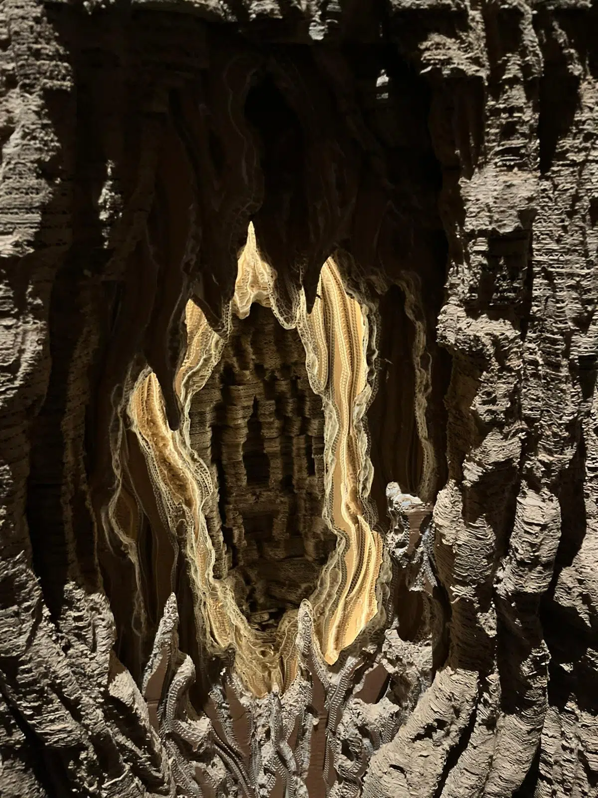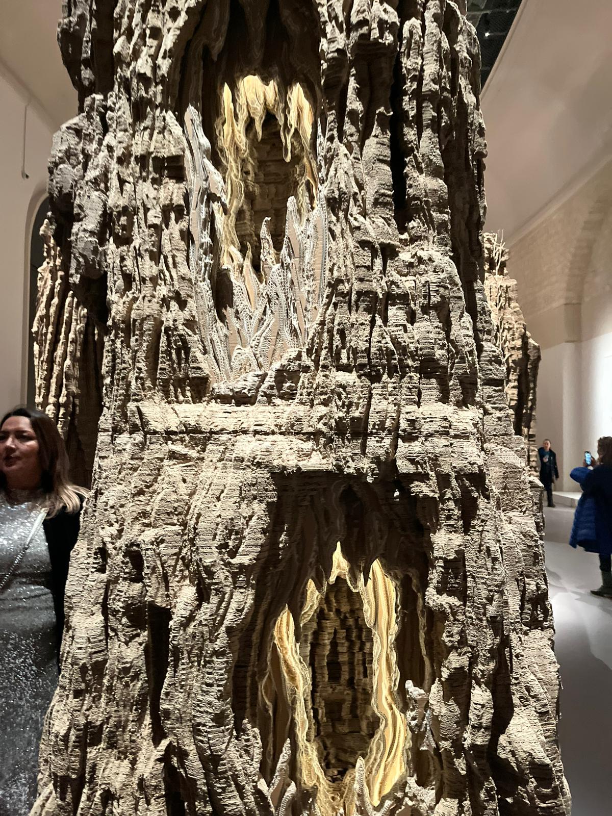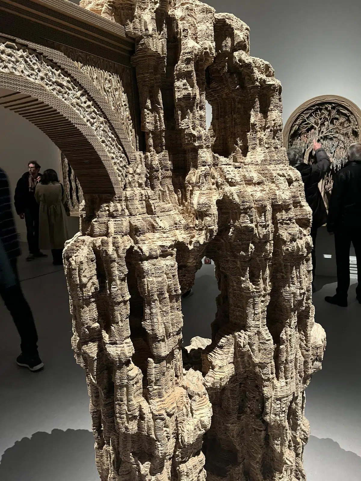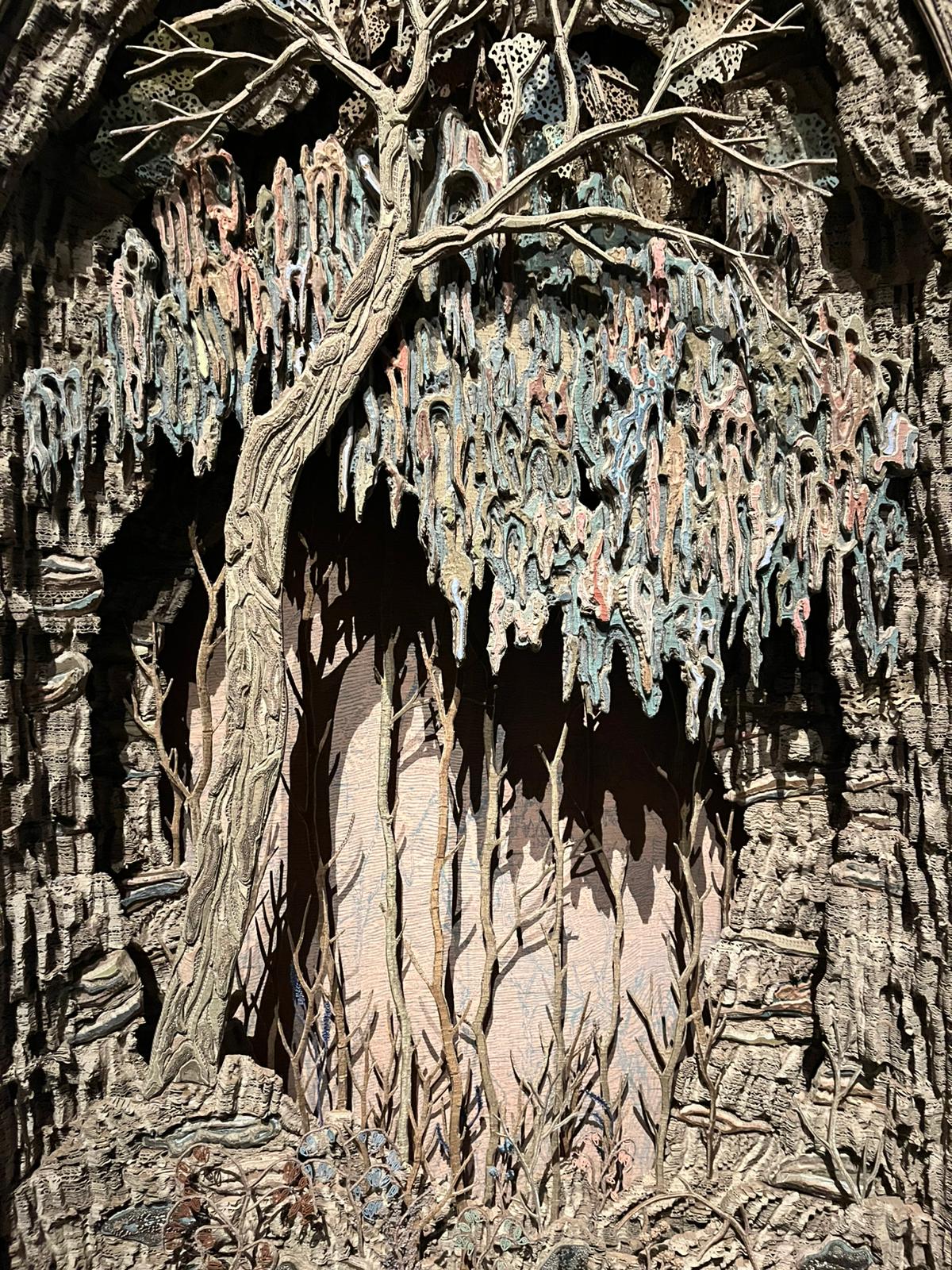 Avec Grottesco, Eva Jospin nous entraîne dans un monde souterrain, presque secret. Des grottes monumentales, des architectures végétales, des reliefs sculptés dans le carton, le textile, la broderie. Des matériaux modestes, travaillés avec une minutie presque obsessionnelle, jusqu’à devenir majestueux.