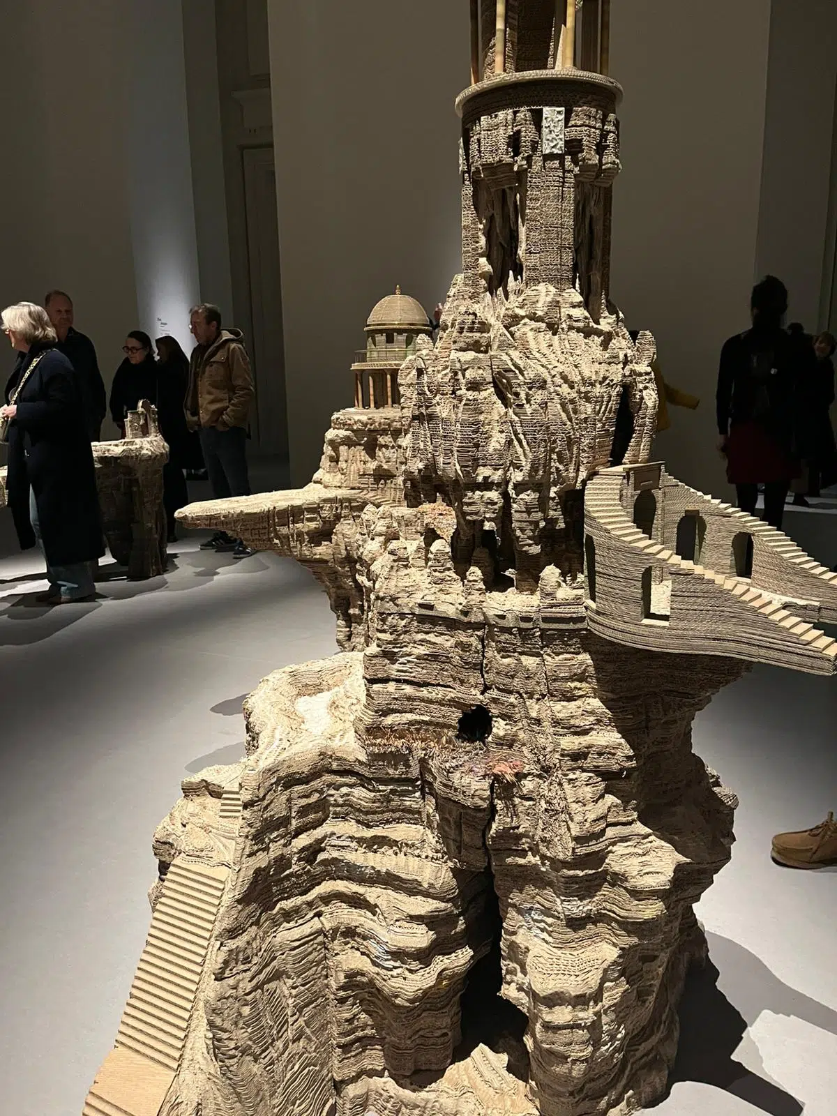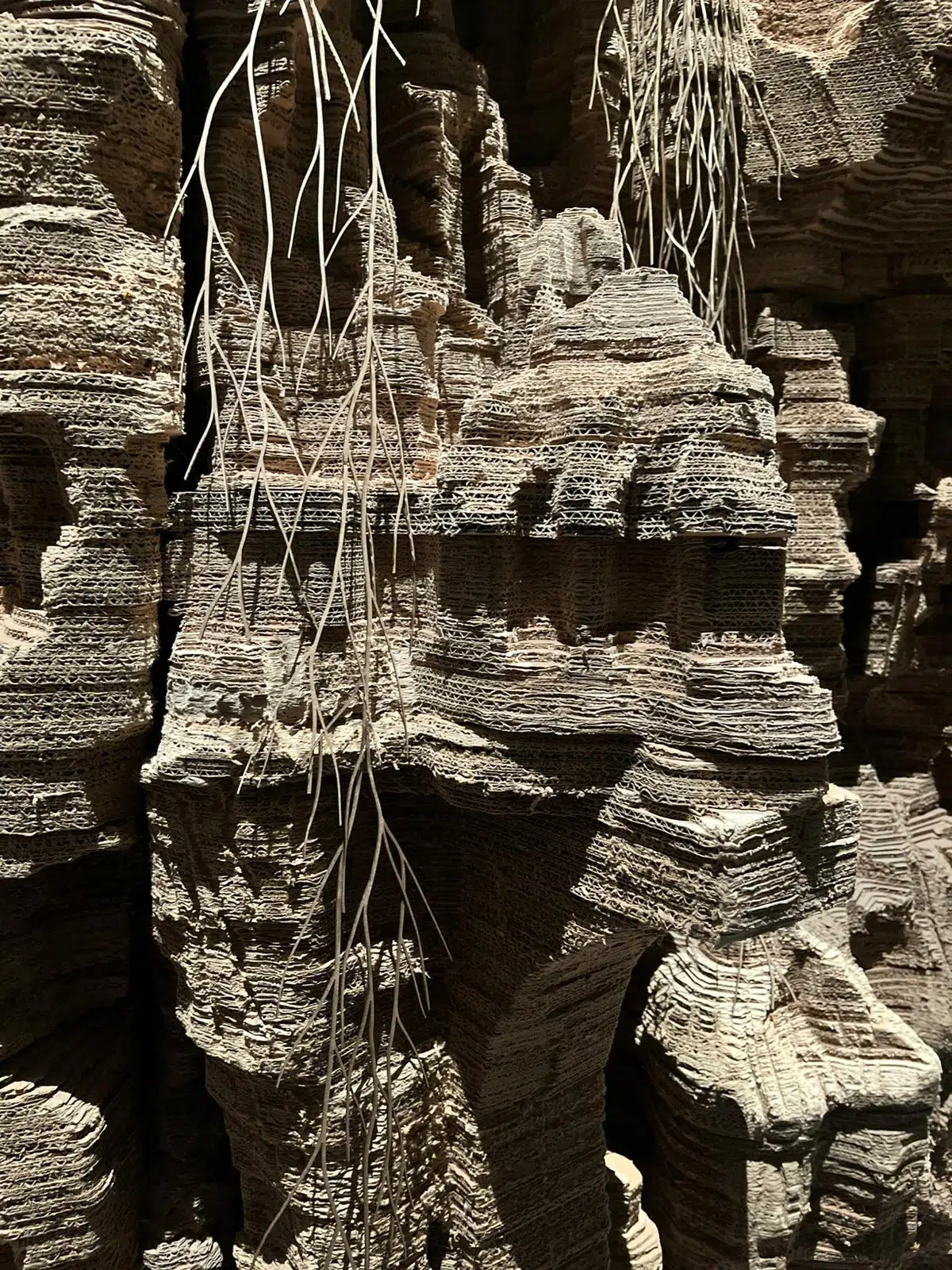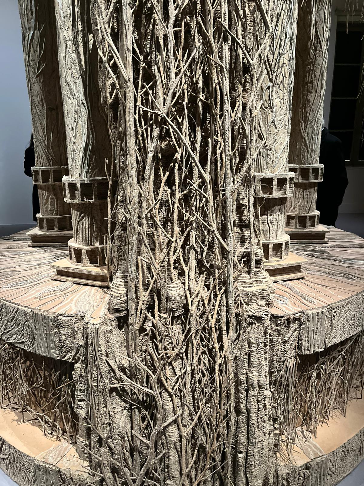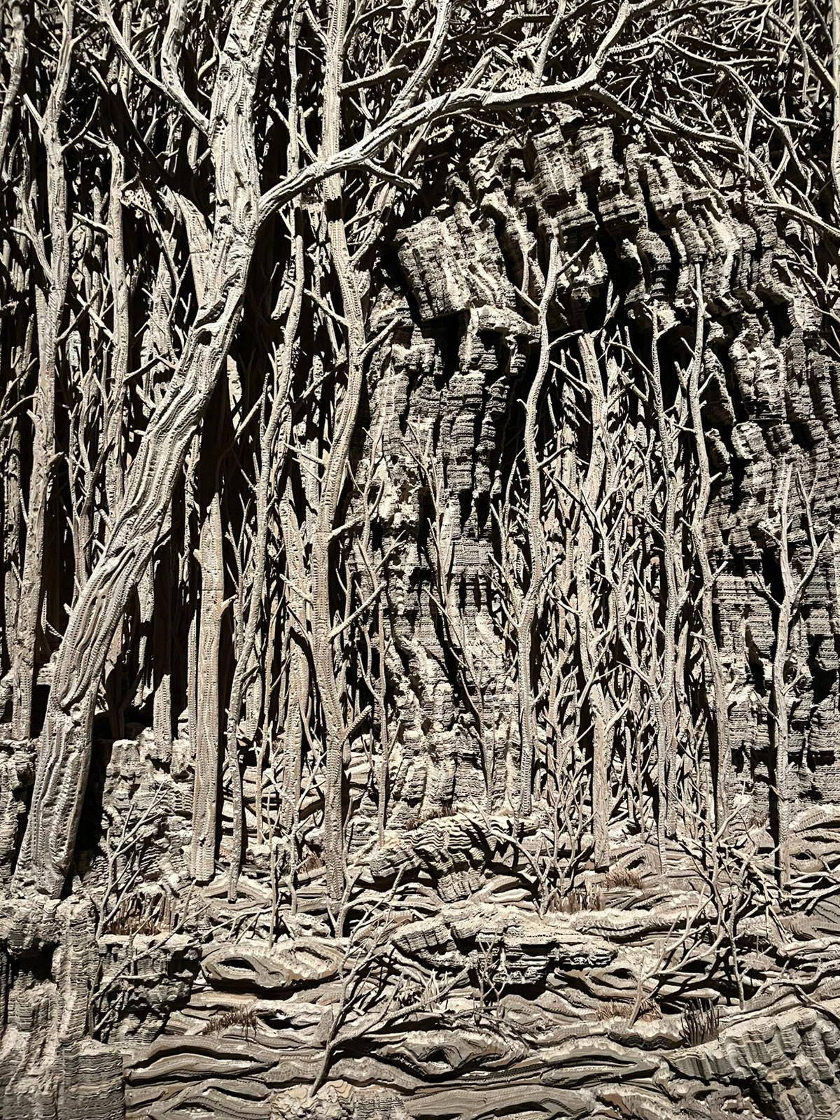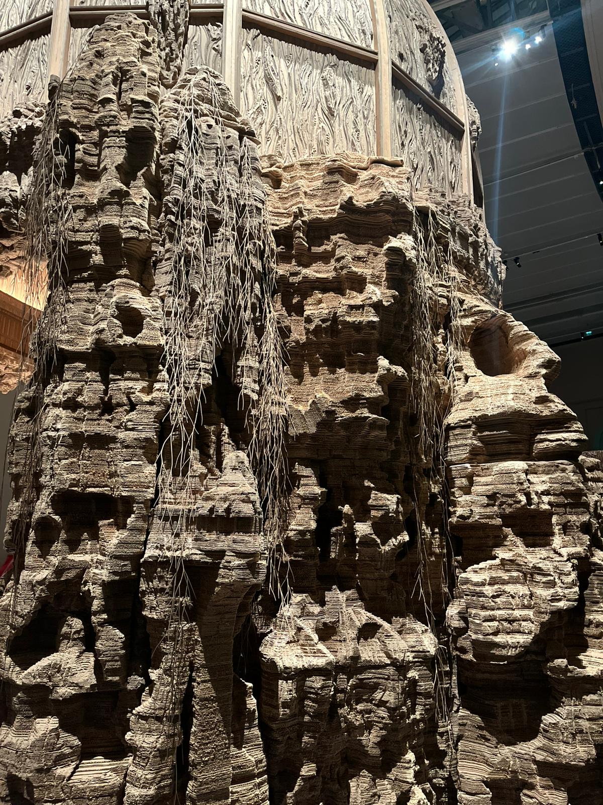 Avec Grottesco, Eva Jospin nous entraîne dans un monde souterrain, presque secret. Des grottes monumentales, des architectures végétales, des reliefs sculptés dans le carton, le textile, la broderie. Des matériaux modestes, travaillés avec une minutie presque obsessionnelle, jusqu’à devenir majestueux.