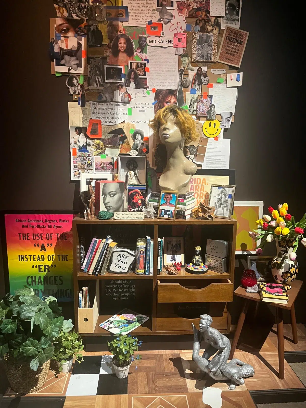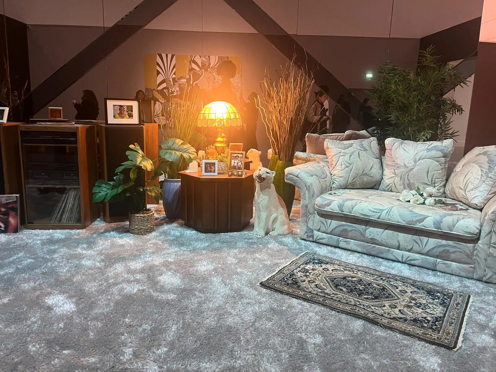 On passe de grandes peintures iconiques à des installations évoquant des intérieurs familiers, inspirés de la vie de l’artiste. Canapés, tapis, papiers peints : l’espace intime devient un lieu politique.