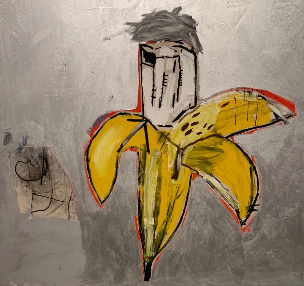 Chaque toile est imprégnée d’éléments de la culture pop’art: grandes marques, objets de consommation de masse, logo de grandes enseignes…