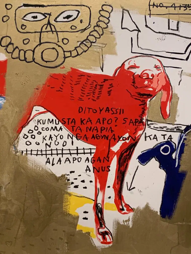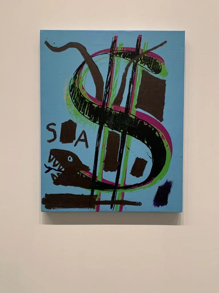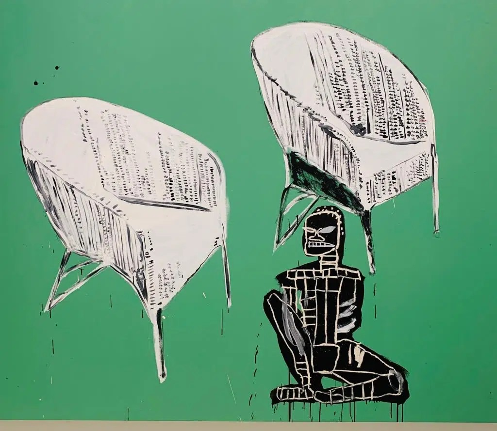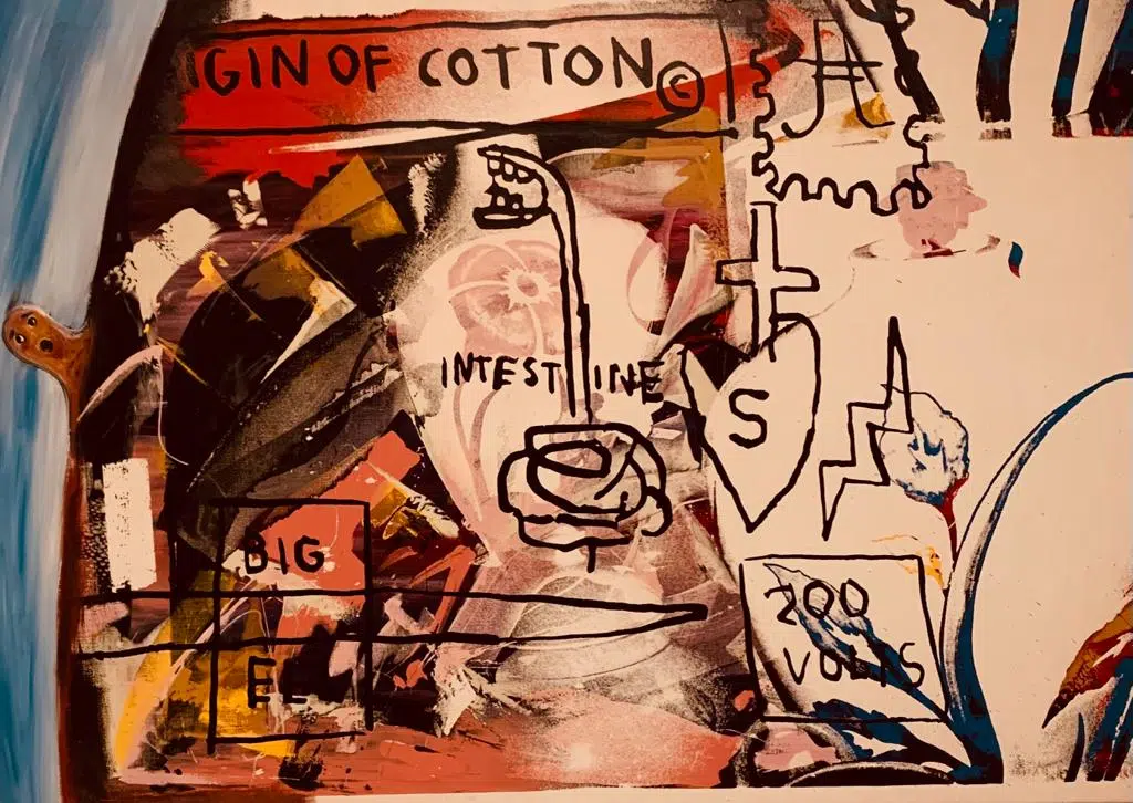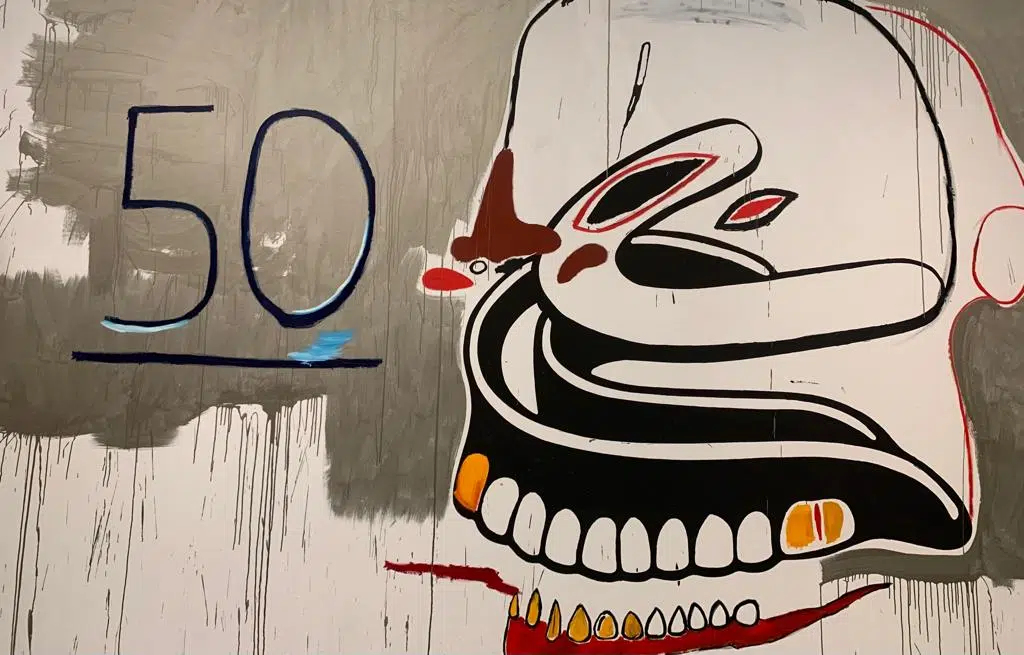 Chaque tableau est une œuvre, dans laquelle les deux artistes se fondent, ne sachant bien qui est Basquiat, qui est Warhol. Quelques indices vous aideront néanmoins à faire la part des choses, notamment la célèbre couronne que l’on retrouve dans les toiles de Basquiat ainsi que les squelettes et cranes. Sa mère lui avait offert à l’âge de sept ans, suite à un accident de voiture, un livre d’anatomie (Grey’s Anatomy), ouvrage qu’il feuillètera régulièrement et dont il s’inspirera.
