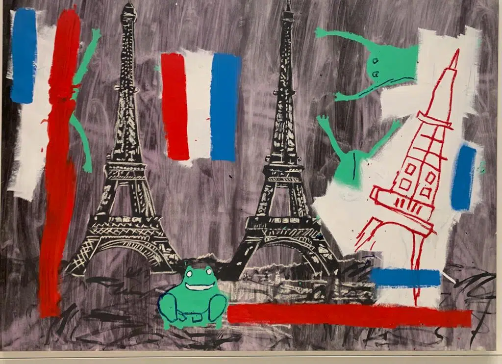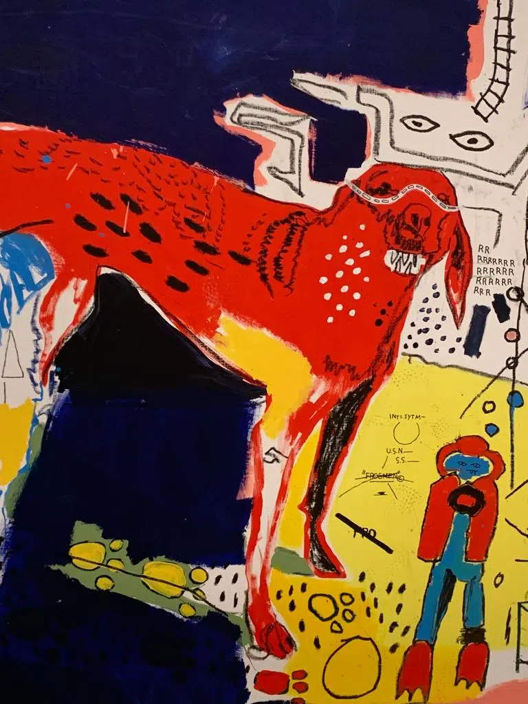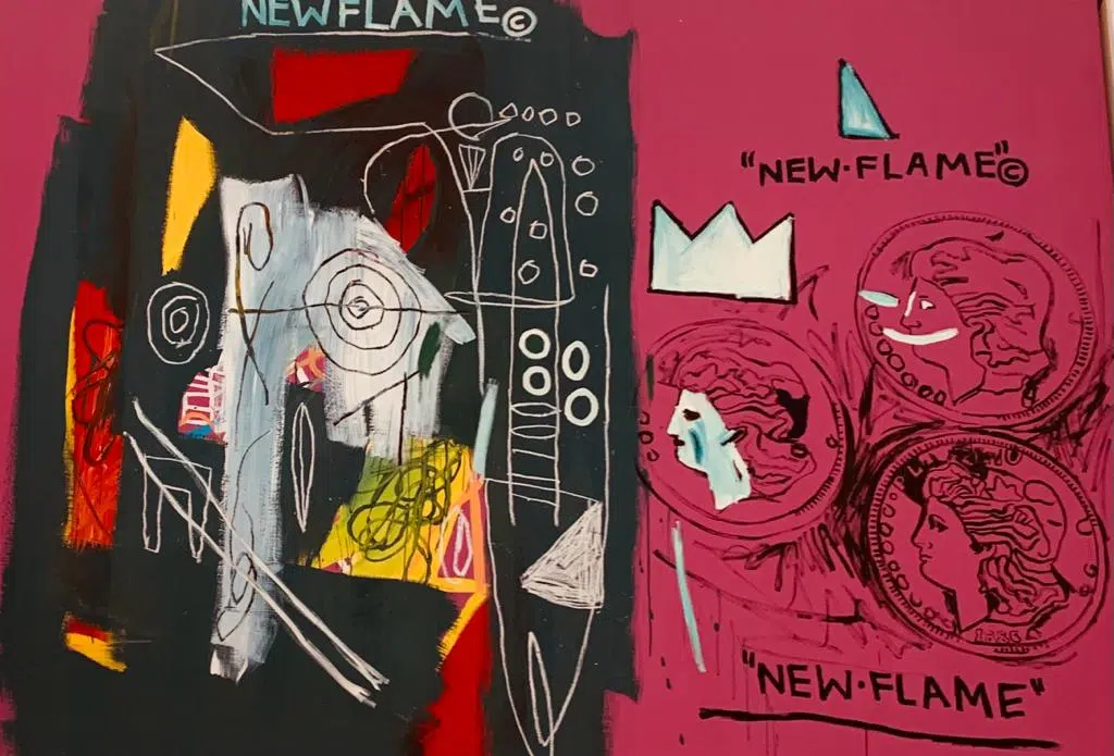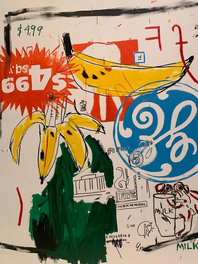 Etonnante association, ne trouvez-vous pas? Entre un Andy Warhol, dont la renommée n’est plus à faire, et un jeune Basquiat, issu des quartiers populaires de New-York, graffeur et d’origine modeste? Rien ne prédestine ces deux-là au coup de foudre artistique. Malgré une première rencontre furtive, pendant laquelle Warhol fera l’acquisition d’une carte postale, dessinée par SAMO (acronyme de SAM Old Shit), ils se retrouveront pour cette unique et incroyable collaboration, très prolifique, qui durera deux ans. Quoi de plus normal finalement? Car Basquiat est un autodidacte, polyglote et passionné de musique, des sons de jazz, de Ravel, qui l’accompagnent dans son travail.