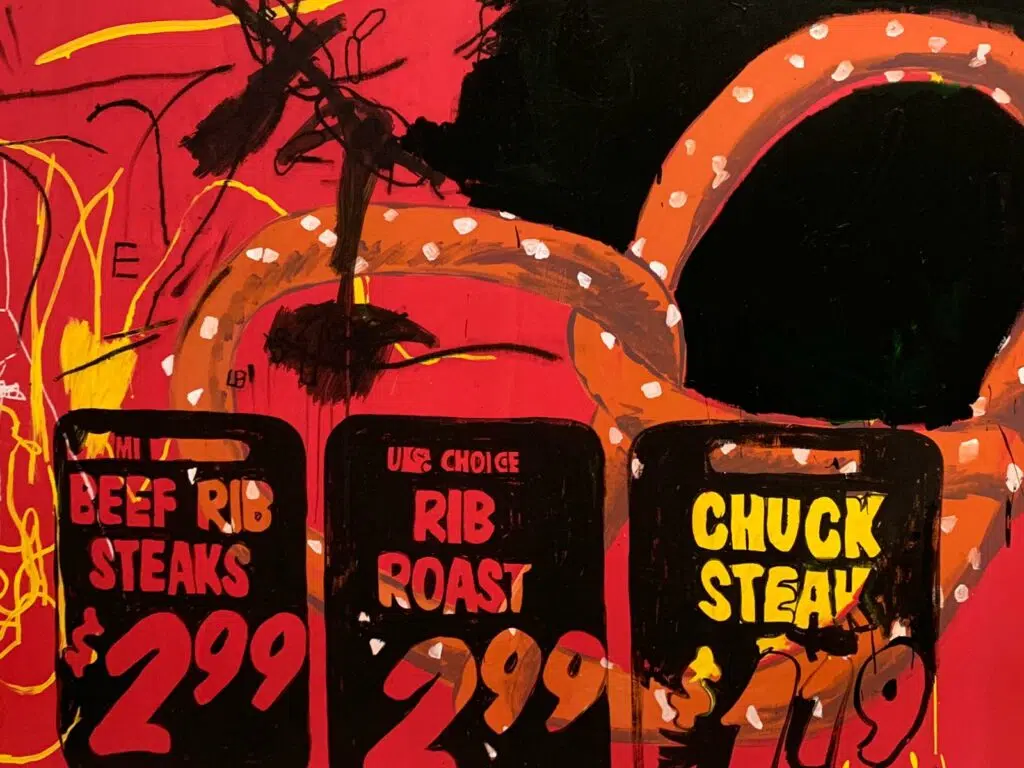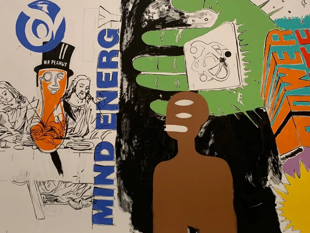 Tout au long de l’exposition, nous découvrons ci et là des éléments très concrets, relatifs à la culture pop’art. De nombreuses toiles affichent des biens de consommation jetables tels que des conserves ou des vêtements de marque. Des baskets Nike en sont un exemple sur l’une des toiles. Certains tableaux sont dédiés à la marque General Electric ou Ford, traduisant ainsi le monopole de ces grandes multinationales.