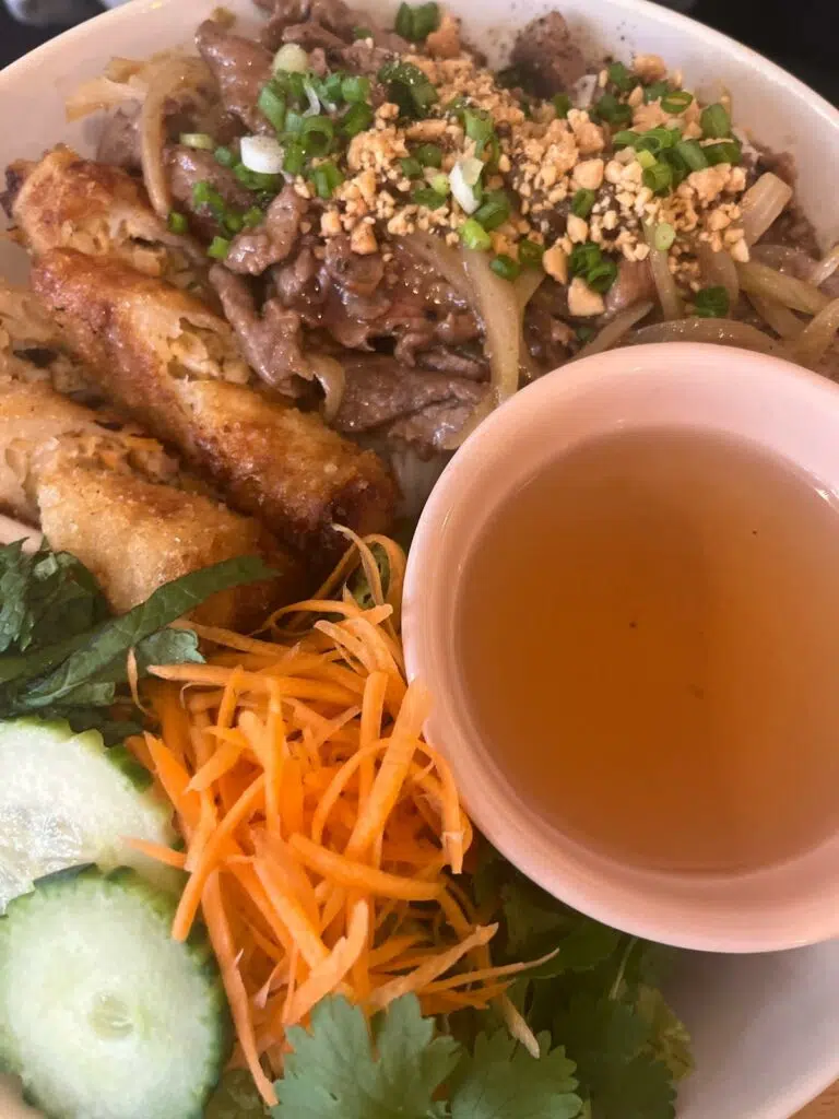 La star de la carte, c’est évidemment le Bo Bun. Imaginez des vermicelles de riz légers et parfaitement cuits, accompagnés de légumes croquants — carottes, concombre, salade — et parsemés d’herbes fraîches comme la coriandre et la menthe. Selon vos envies, vous pouvez choisir du bœuf, du poulet, du porc ou du tofu grillé. La sauce nuoc-mâm, légèrement sucrée et acidulée, vient lier le tout et sublimer chaque bouchée. Chaque plat est préparé sous vos yeux avec précision, et on sent que tout est fait avec passion.