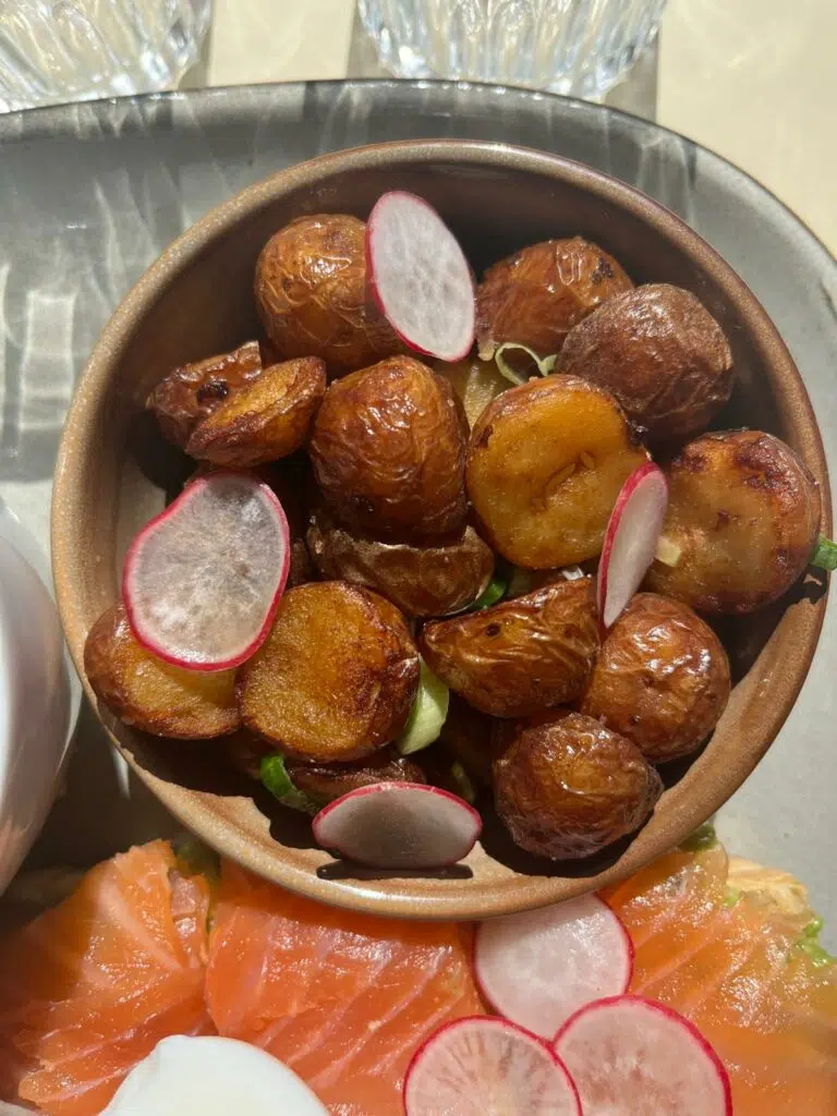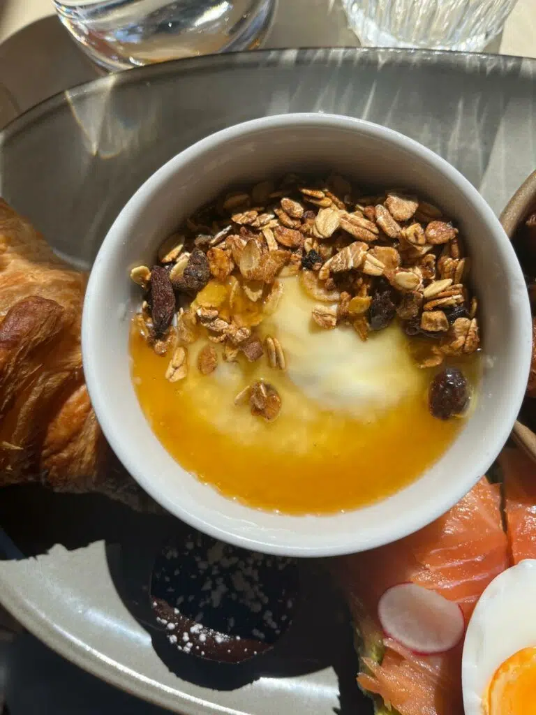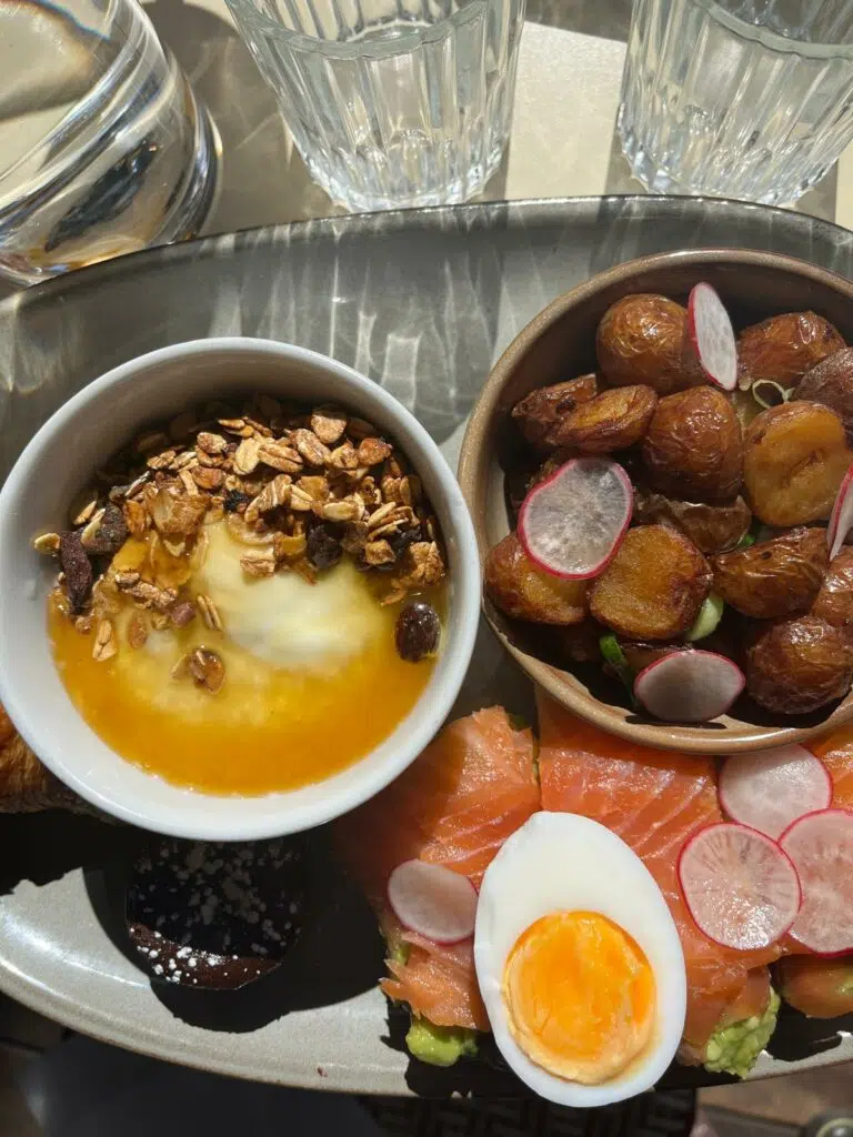 L’assiette principale est un vrai bonheur visuel et gustatif : pommes de terre grenailles parfaitement rôties, toast à l’avocat comme on les aime, bien crémeux et relevé d’un trait de citron, parsemé d’une belle tranche de saumon, finement tranché et d’une fraîcheur irréprochable. À côté, une petite sélection de viennoiseries dorées et croustillantes nous rappelle que l’on est bien en terre française.