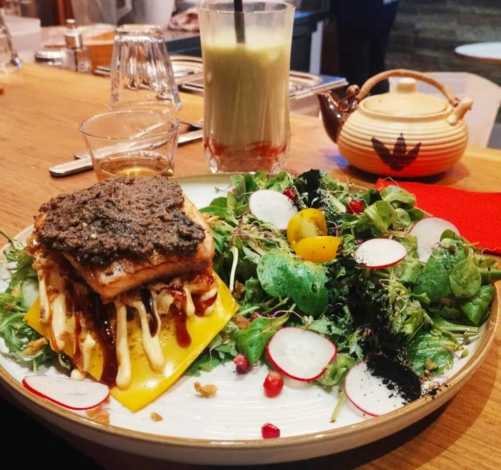 Nous avons testé le Truffle Soma, ce pain de riz en croûte de panko avec son filet de saumon mi-cuit, cheddar braisé et sa purée de truffe, et le C.L.T Aldini, avec son bun au charbon végétal, spicy katsu chicken, et avocat tranché; tous deux accompagnés de la succulente salade maison Kimochi composée de tomates cerise, radis rouge, wakamé et jeunes pousses de saison. Sains et assaisonnés à la perfection, les plats salés du brunch Kimochi étonnent et dépaysent.