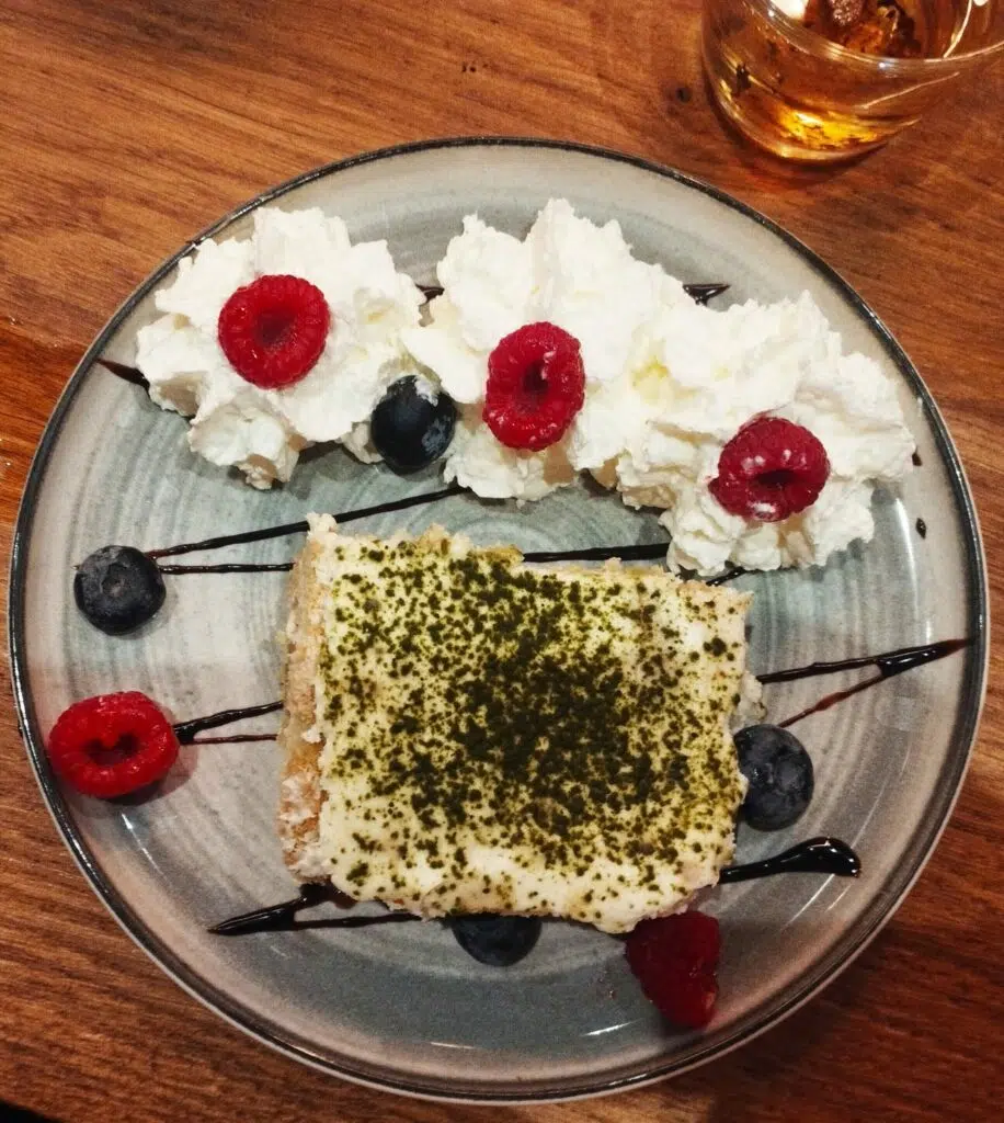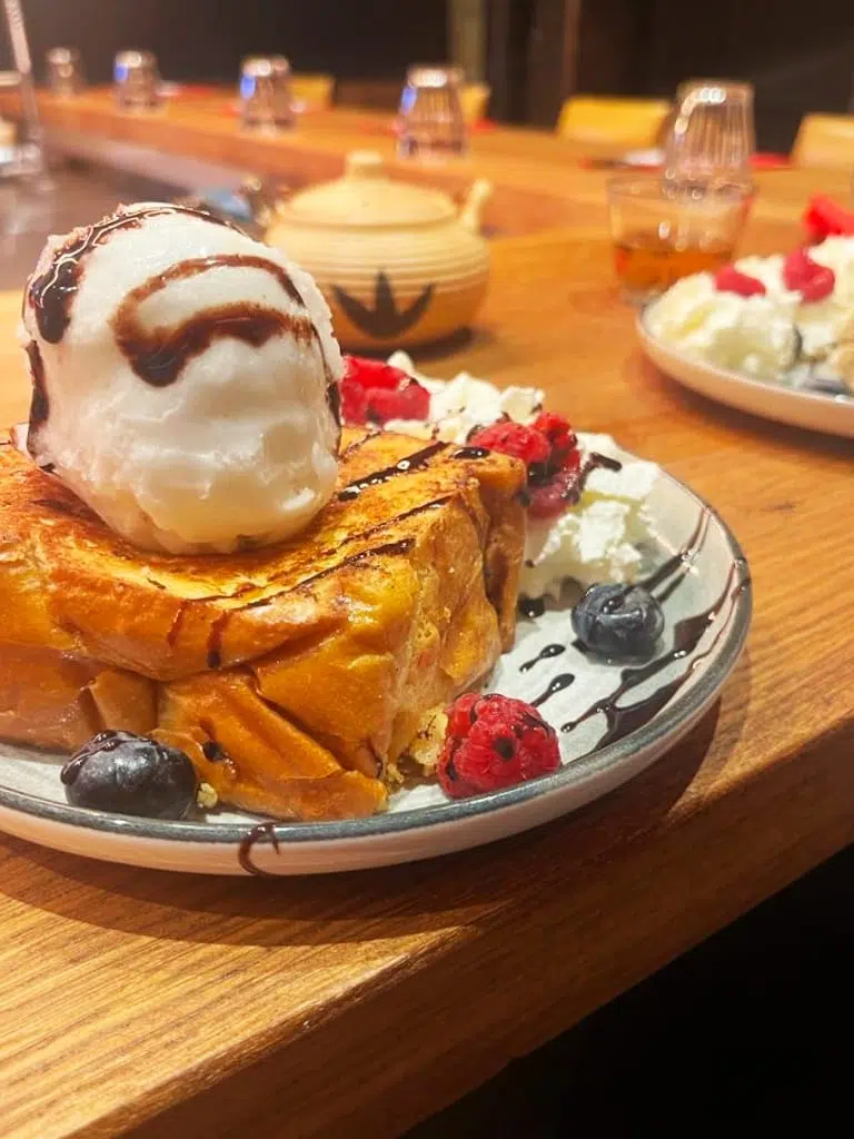 L’expérience se poursuit avec les plats sucrés. Notre choix se porte sur le Pain Duper, une brioche toastée moelleuse accompagnée de chantilly, fruits rouges et d’une boule de glace au parfum au choix (Yuzu pour le côté acidulé), et le Tiramisu Japonais (rien que le nom intrigue).