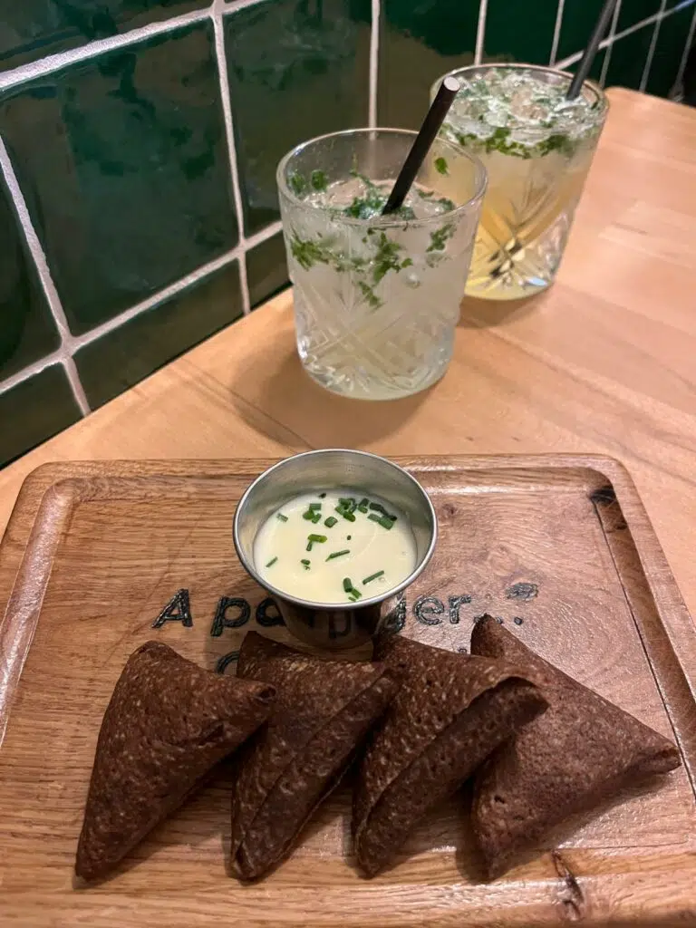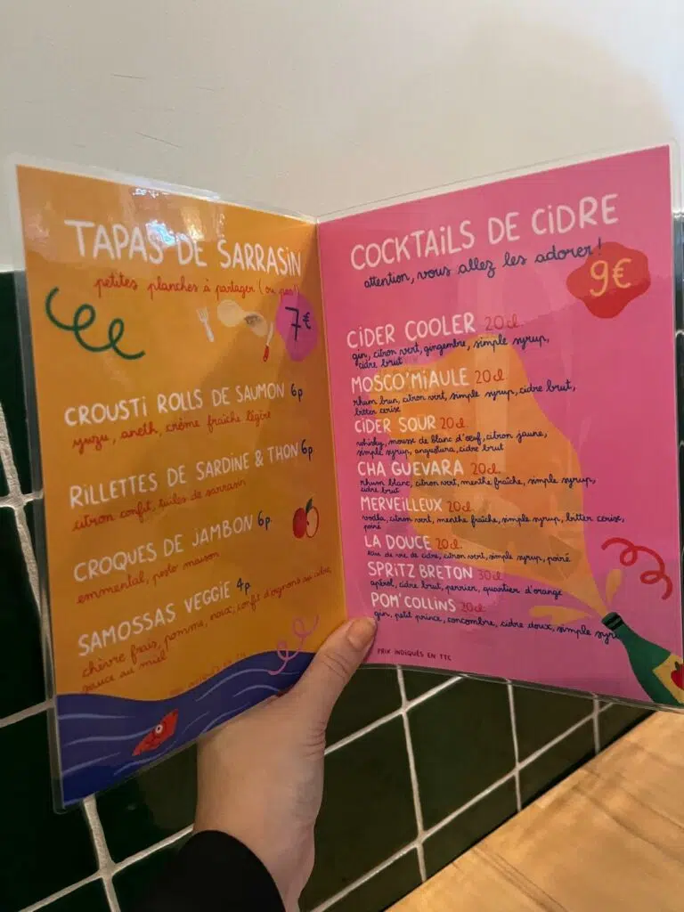 Côté sucré, les crêpes de froment se parent de saveurs réconfortantes : compotée de pommes et crème de marron, chocolat noisette maison, miel et éclats de spéculoos. Le tout accompagné d’un cidre doux, d’un poiré frais ou d’un cocktail original à base de cidre, selon l’humeur du jour. Et pour les indécis, la carte propose aussi quelques petites assiettes à partager : roulés au saumon gravlax, samossas végétariens, planches à picorer.