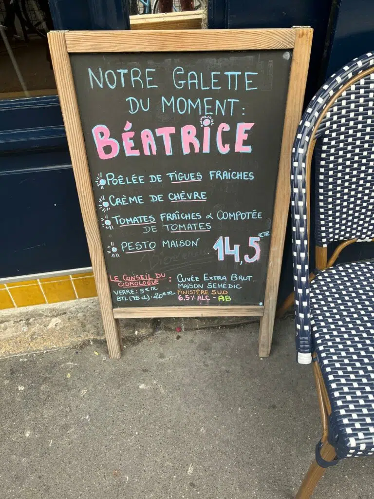Les galettes sont proposées entre 12 et 15 €, les crêpes sucrées autour de 6 €, et les formules déjeuner débutent à 17,90 €. Un rapport qualité-prix cohérent au vu de la qualité des produits et du soin apporté à chaque plat. On ressort de table satisfait, sans lourdeur, et avec l’envie d’y revenir.