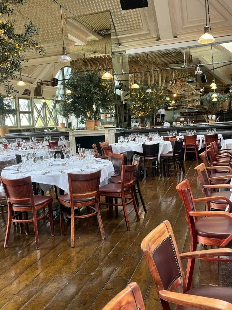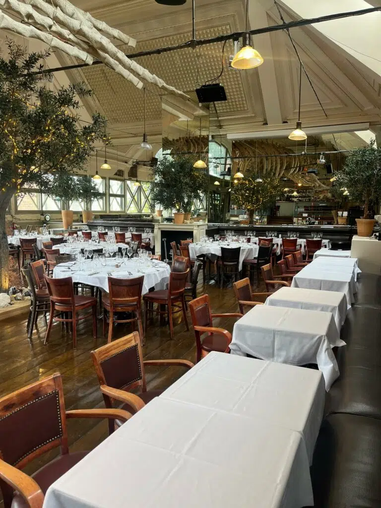 L’adresse occupe une ancienne halle de marché, vaste et lumineuse, qui a été transformée en un lieu unique. La première chose qui frappe en entrant ? Le squelette géant de plésiosaure de 22 mètres suspendu au plafond. Une pièce qui donne immédiatement le ton au Café la Jatte : ici, on aime surprendre et créer l’effet « waouh ».