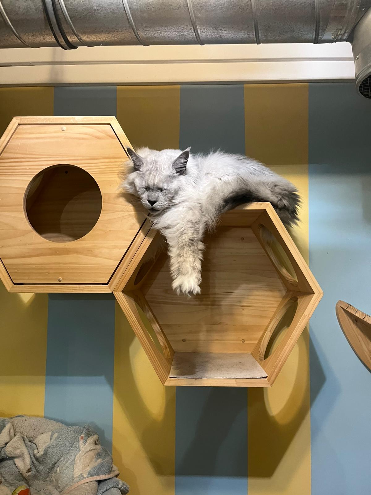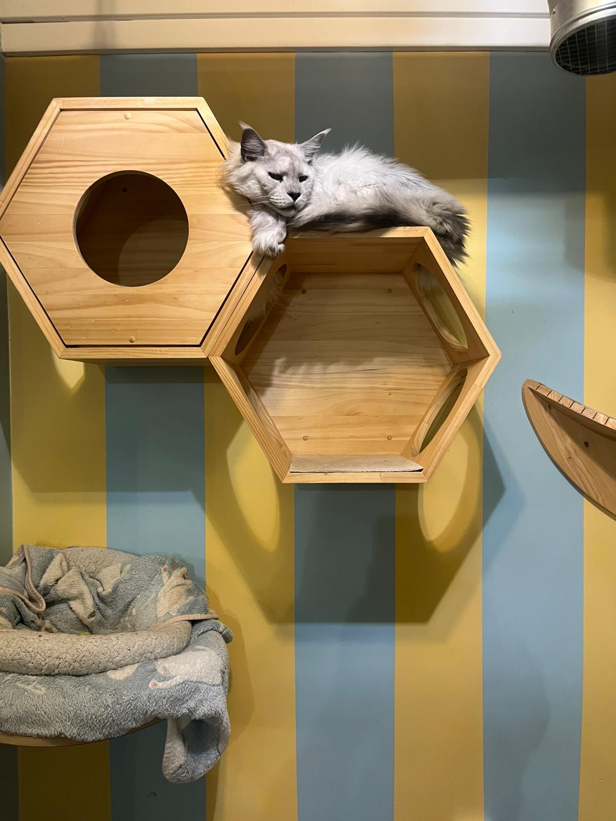 Derrière la façade, on découvre un espace lumineux, pensé pour le confort autant des visiteurs que des chats. La décoration est douce, sans surcharge : des matières chaleureuses, des assises confortables, une atmosphère apaisante. Ici, tout semble inviter à baisser le ton, naturellement.