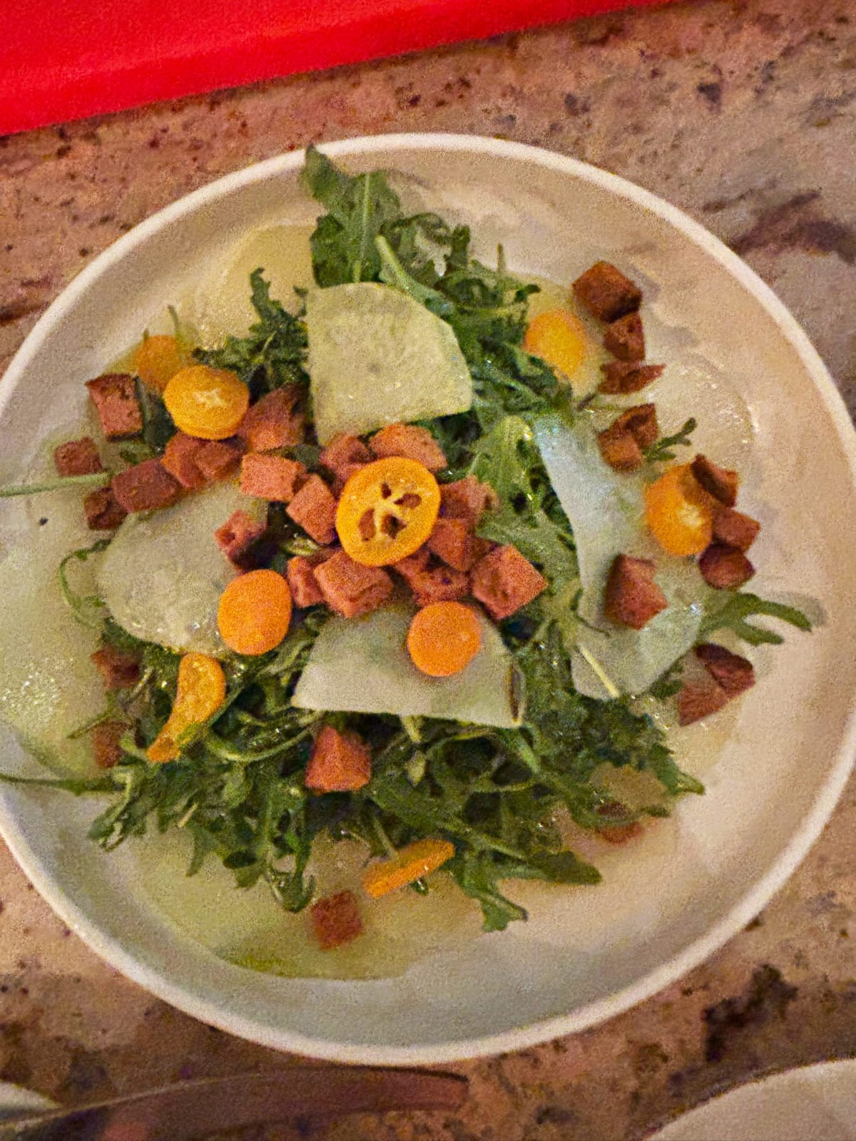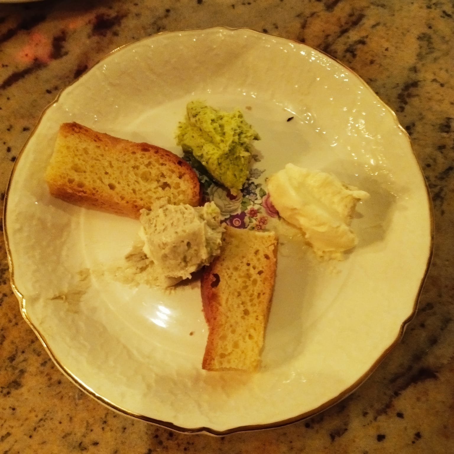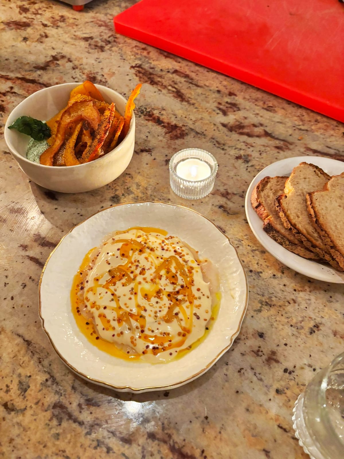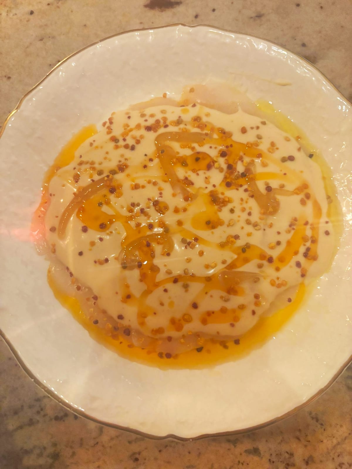 La carte du soir commence avec des propositions qui invitent au partage. Le trio de beurres est un classique revisité : on découvre différentes textures et saveurs qui se marient à merveille avec un bon pain frais, préparant le palais pour la suite du repas. La tempura de potimarron, légère et croustillante, surprend par son moelleux intérieur et sa douce note sucrée, parfaitement équilibrée par la friture délicate. Quant au carpaccio de Saint-Jacques, il séduit par sa fraîcheur et son fondant, relevé d’un trait d’huile d’olive et d’une pointe d’agrumes pour accentuer les saveurs naturelles de la mer.