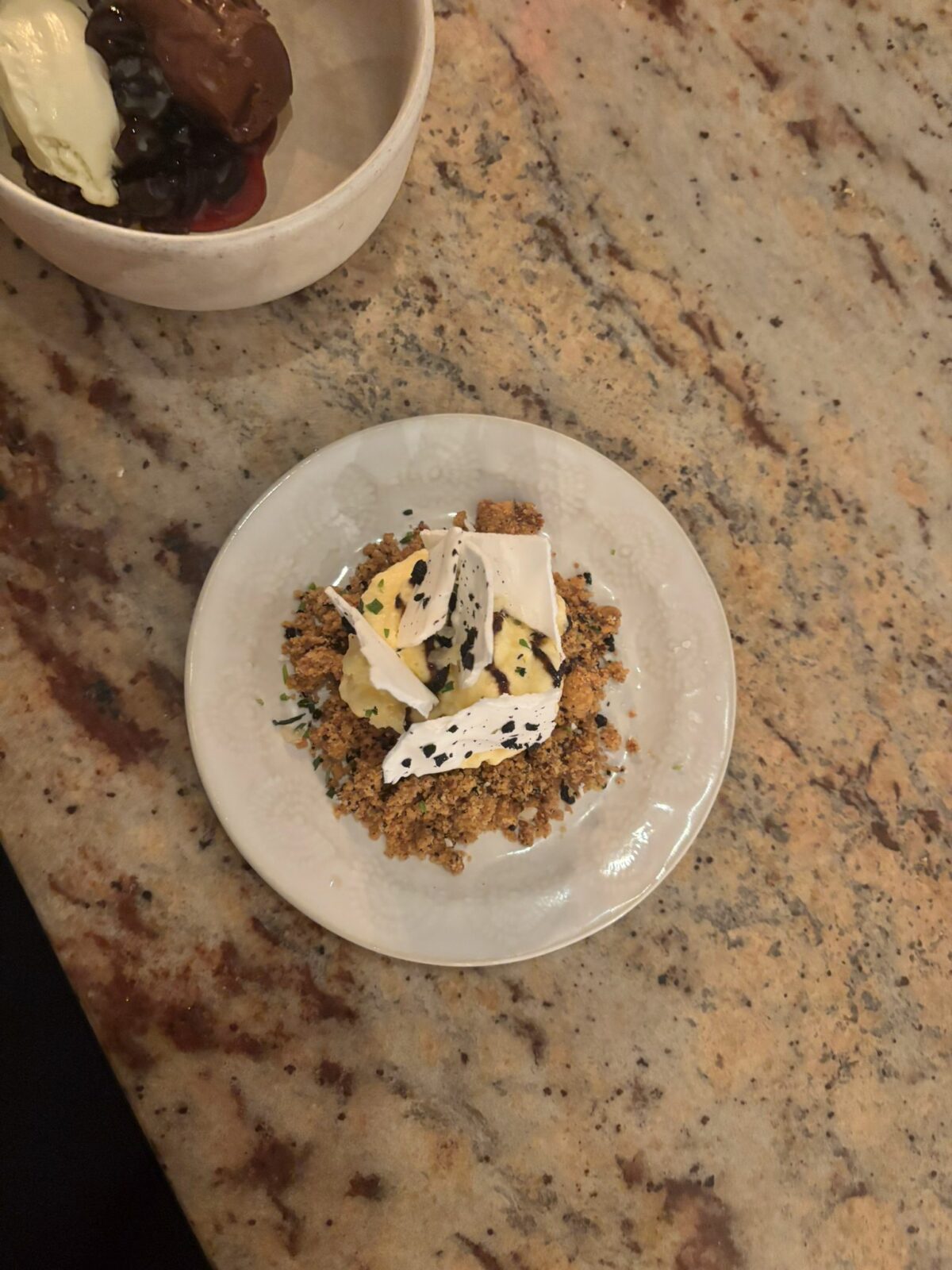 La carte du soir se conclut avec des desserts autour de la ganache, riches et fondants, parfaits pour terminer le repas sur une note douce et intense. Chocolat, textures crémeuses et petits détails raffinés apportent une touche finale qui souligne le soin apporté à chaque assiette.