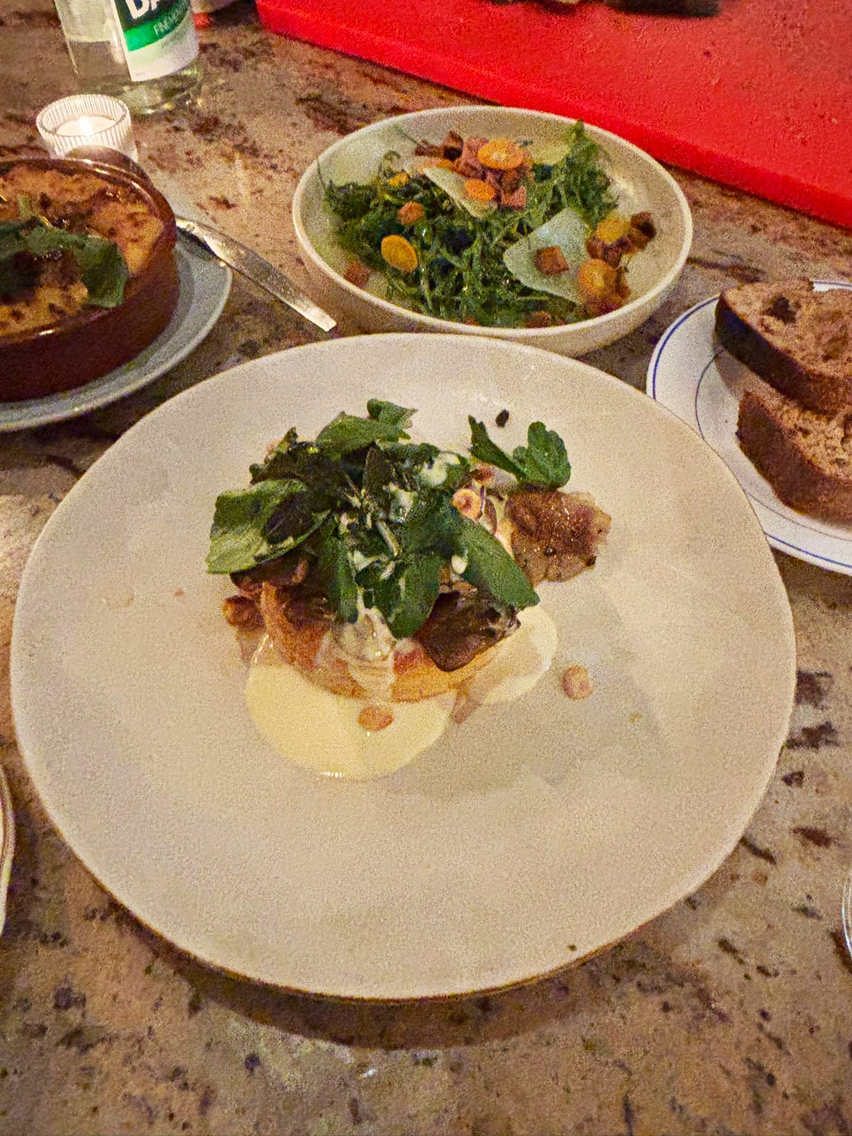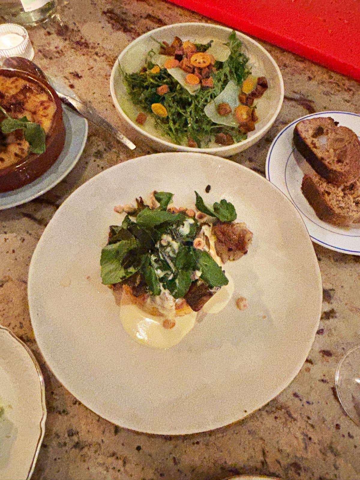 Pour le plat principal, le parmentier de coq au vin revisite un grand classique français avec élégance : la viande est fondante et parfumée, tandis que la purée onctueuse apporte un côté réconfortant. La tombée de chou rouge, légèrement acidulée et assaisonnée avec soin, accompagne chaque plat en apportant une fraîcheur bienvenue. La carte du soir sait allier rusticité et sophistication, offrant une expérience gustative complète.