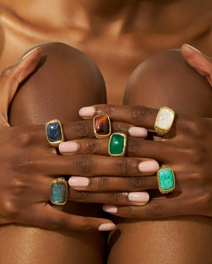 Ancienne juriste devenue créatrice, Caroline de Benoist imagine des bijoux qui ne passent pas inaperçus : pierres fines, formes graphiques, inspiration symbolique… Tous ses modèles sont fabriqués à la main, entre Paris et Jaipur. Un style libre, solaire, haut en couleur.