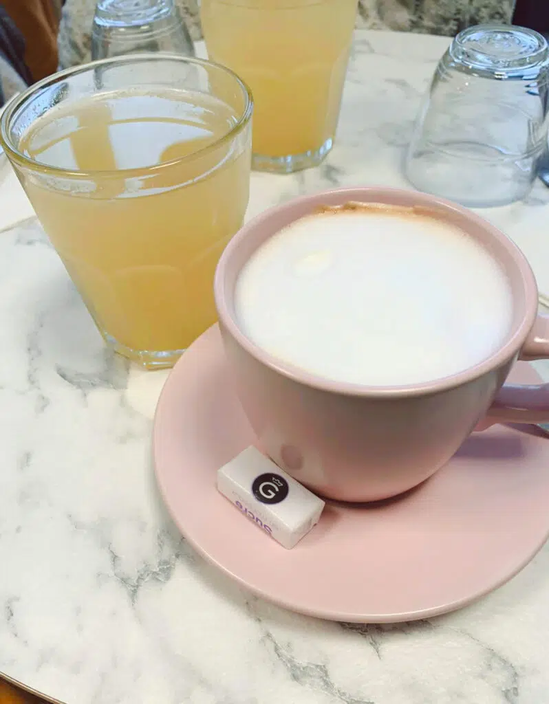 On se met à table et on débute le brunch, confortablement installées, avec une boisson fraiche (au choix, une limonade avec une touche de gimgembre ou un jus d’orange frais) ainsi qu’une boisson chaude. Vous pourrez choisir sur la carte du menu: les classiques cafés, latte, et autres variétés de thé vous sont proposées. J’ai pour ma part opté pour le cappuccino, super onctueux et bien préparé 🙂