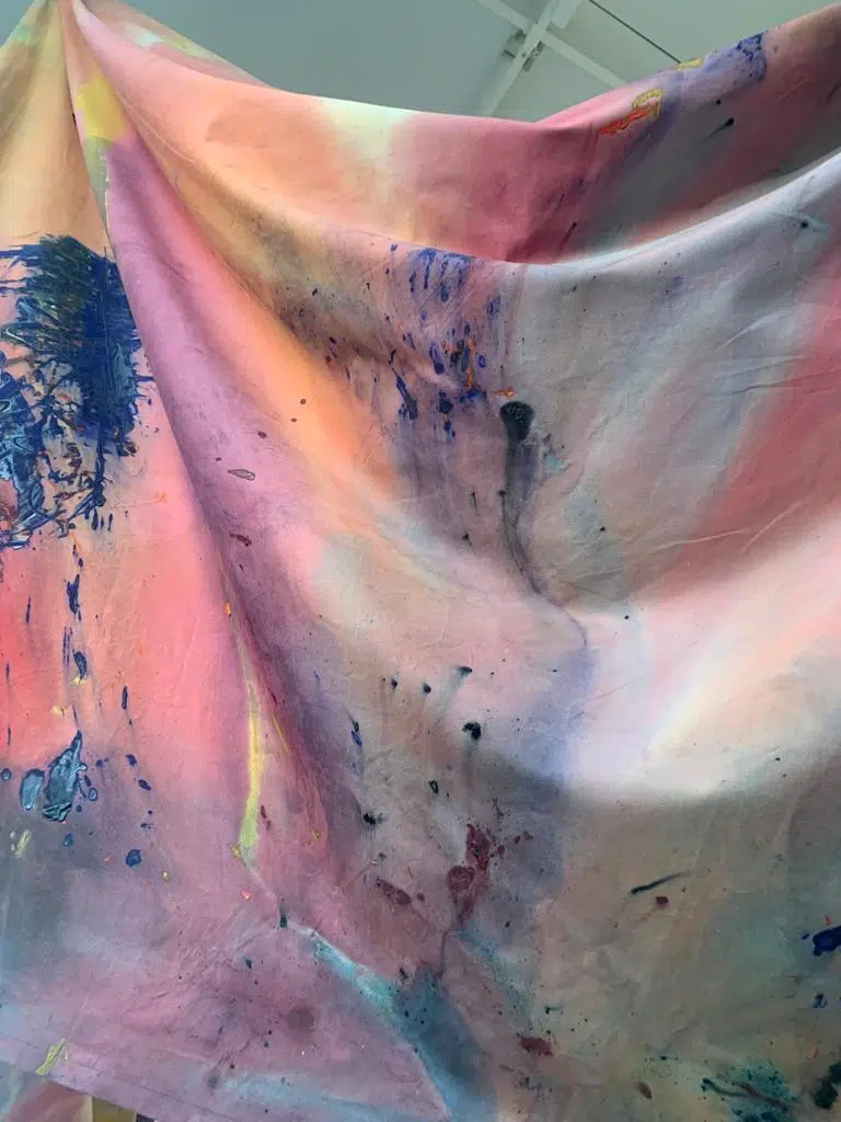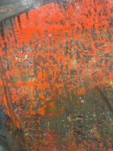 Megan Rooney présente également une œuvre immense. La toile est géante et les couleurs flamboyantes. Le geste est impulsé par le corps. Les techniques employées sont diverses mais le résultat est unique.