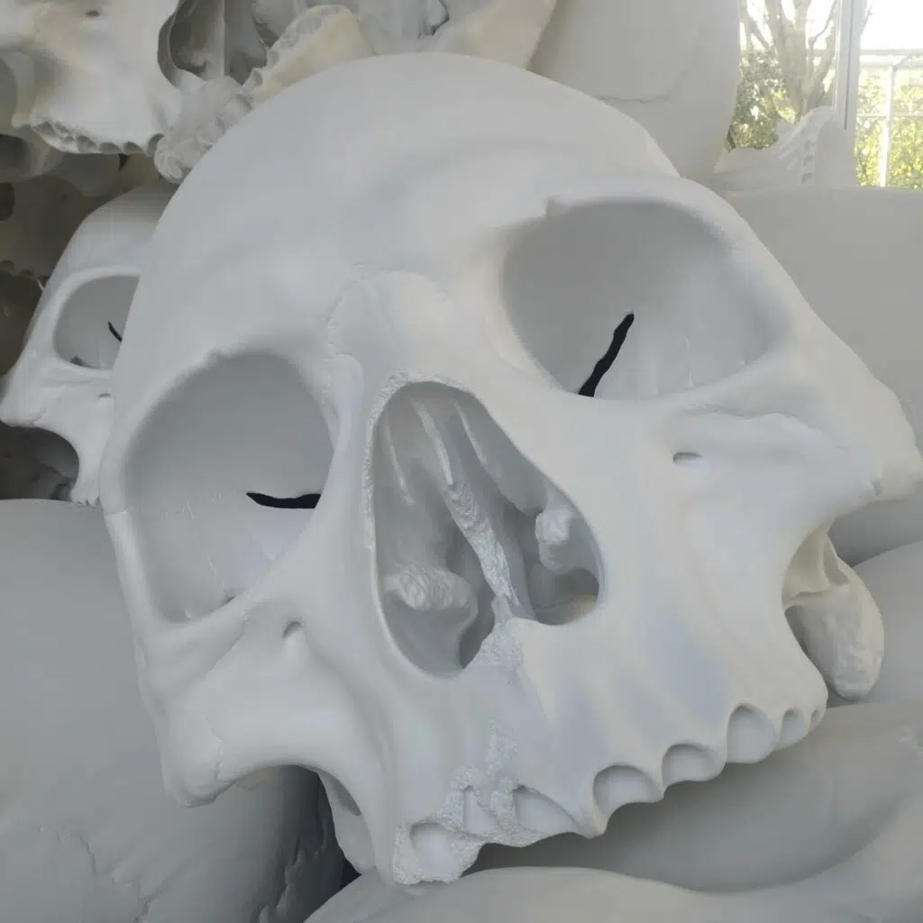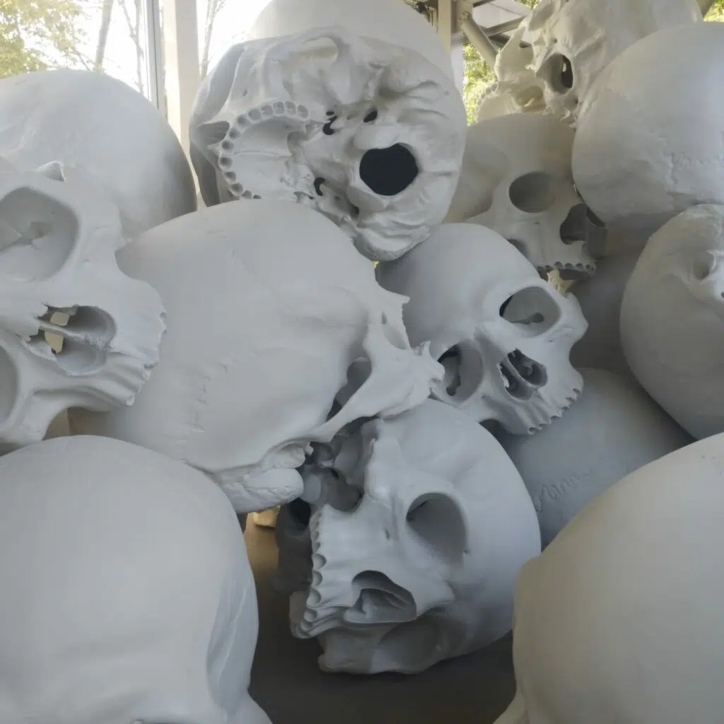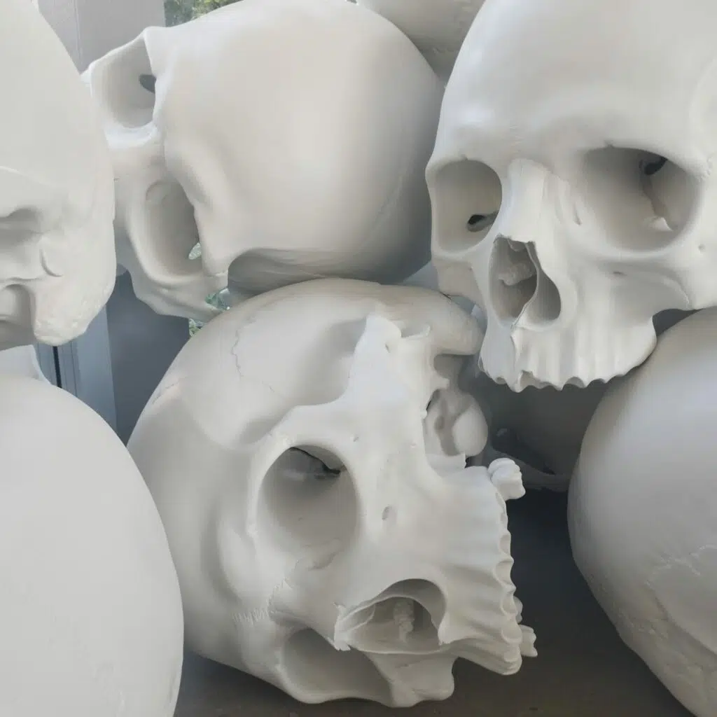 Mass est une œuvre aboutie, composée d’une centaine de cranes humains gigantesques, jonchant le sol de la Fondation. Ces cranes blancs massifs, tellement vivants, imposants, nous invitent à la réflexion sur la mort et sur notre rapport à celle-ci. Outre l’aspect philosophique, nous restons époustouflés par le génie de Ron Mueck, qui propose ici, un travail acharné, sans commune mesure.