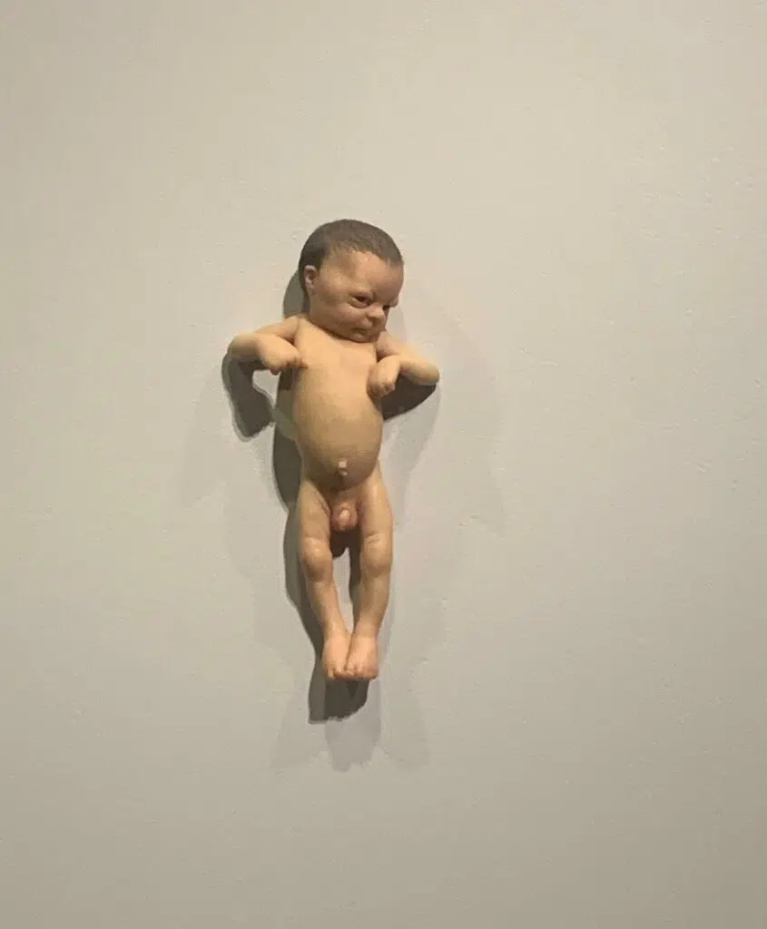 A Girl est incontestablement la pièce la plus incroyable de la visite, intrigante, sensationnelle, irréelle. Aucun superlatif ne peut décrire le sentiment provoqué par cette œuvre, d’un réalisme presque fou. On y voit un bébé fille jeter son premier regard sur le monde. Ses yeux, candides, les plis de son corps, le cordon ombilical et ses cheveux naissants, réveillent en nous ce qu’il y a de plus fragile. Immaculée de sang, la fille découvre l’absurdité et la beauté de la vie, encore frêle. De longues minutes sont nécessaires pour apprivoiser la sculpture, en faire le tour, la comprendre.
