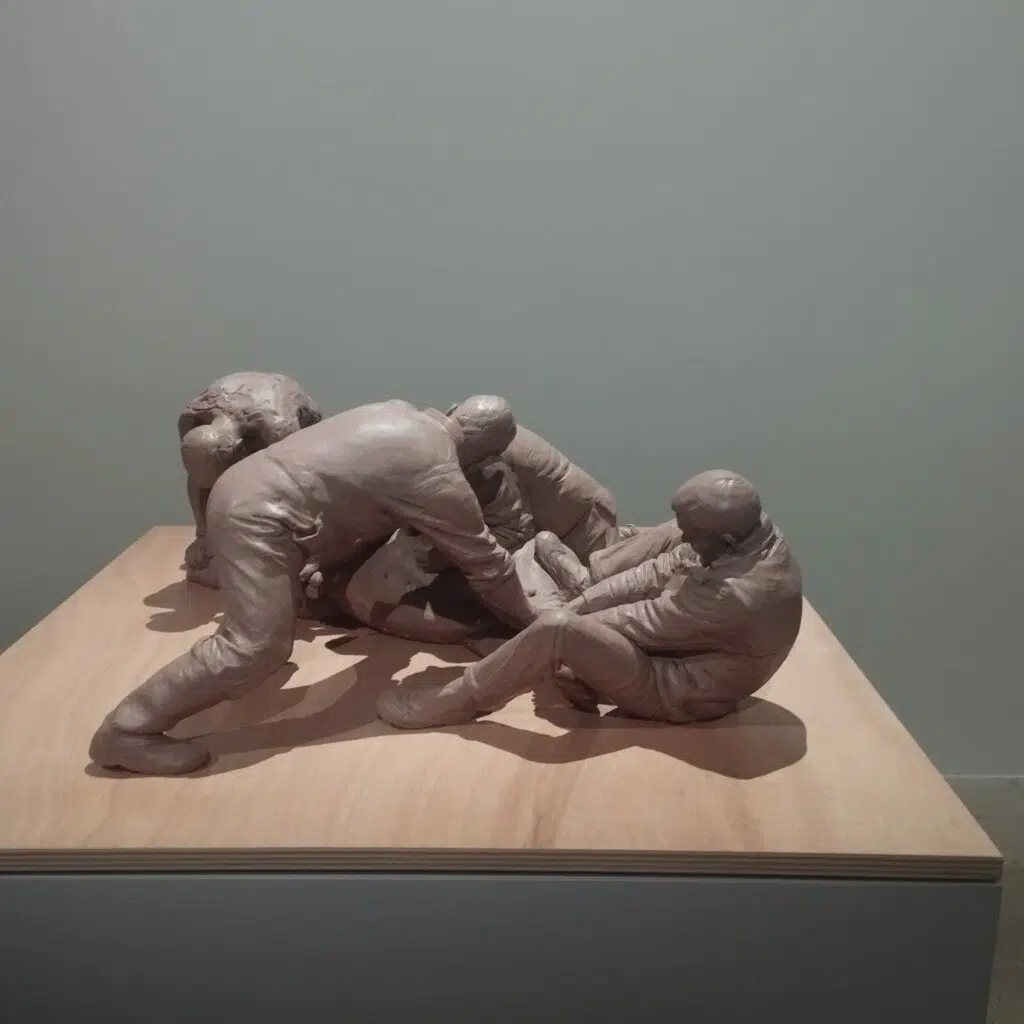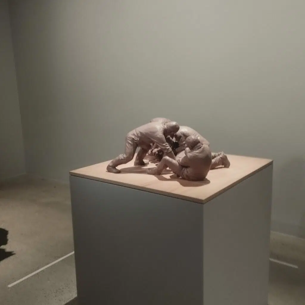 Les trois chiens noirs, dans la pénombre, aux proportions gigantesques, nous font reculer d’un pas. Domestiques ou de garde, le doute s’installe. Avec cette sculpture, Ron Mueck réveille en nous nos peurs les plus profondes, créées par l’inconscient collectif.