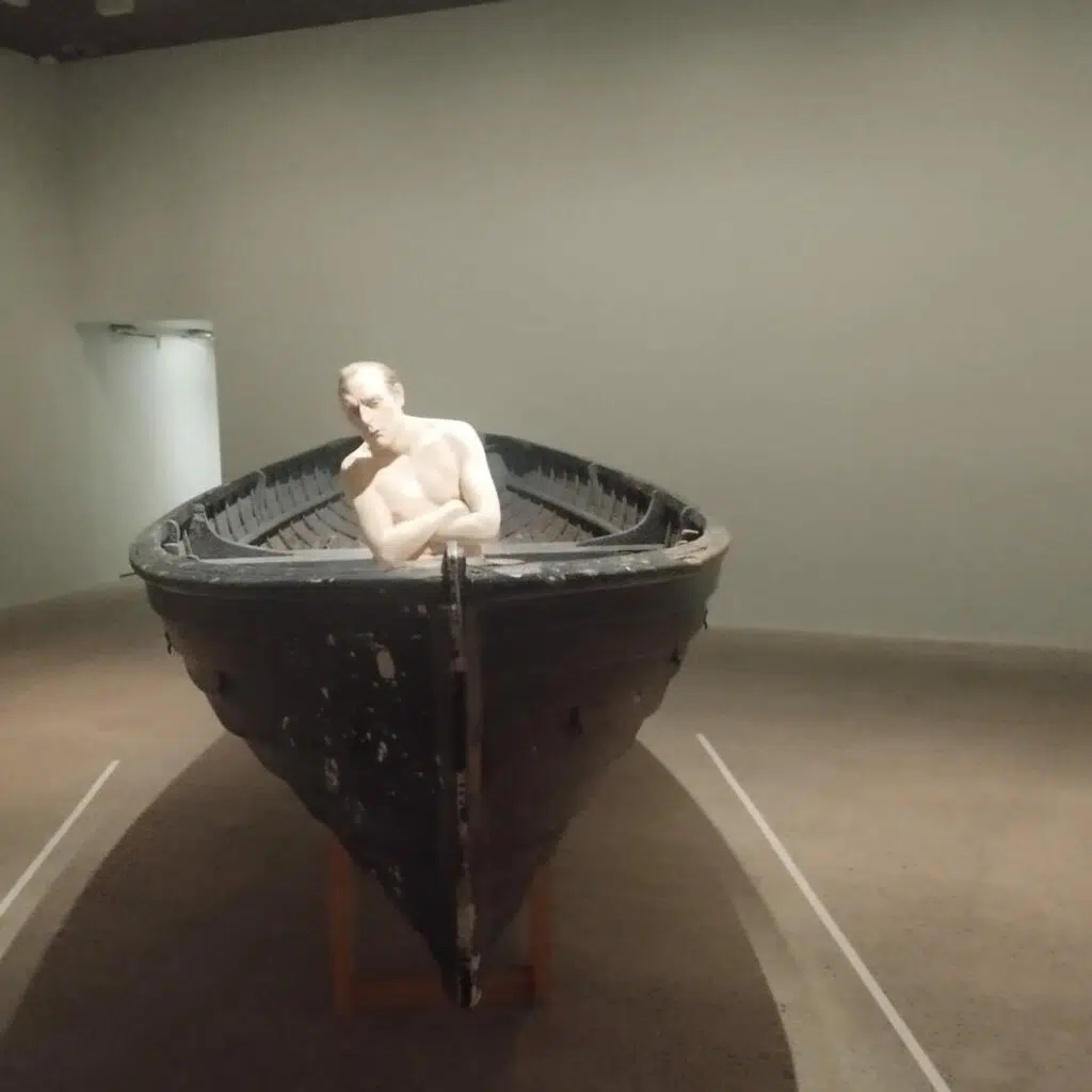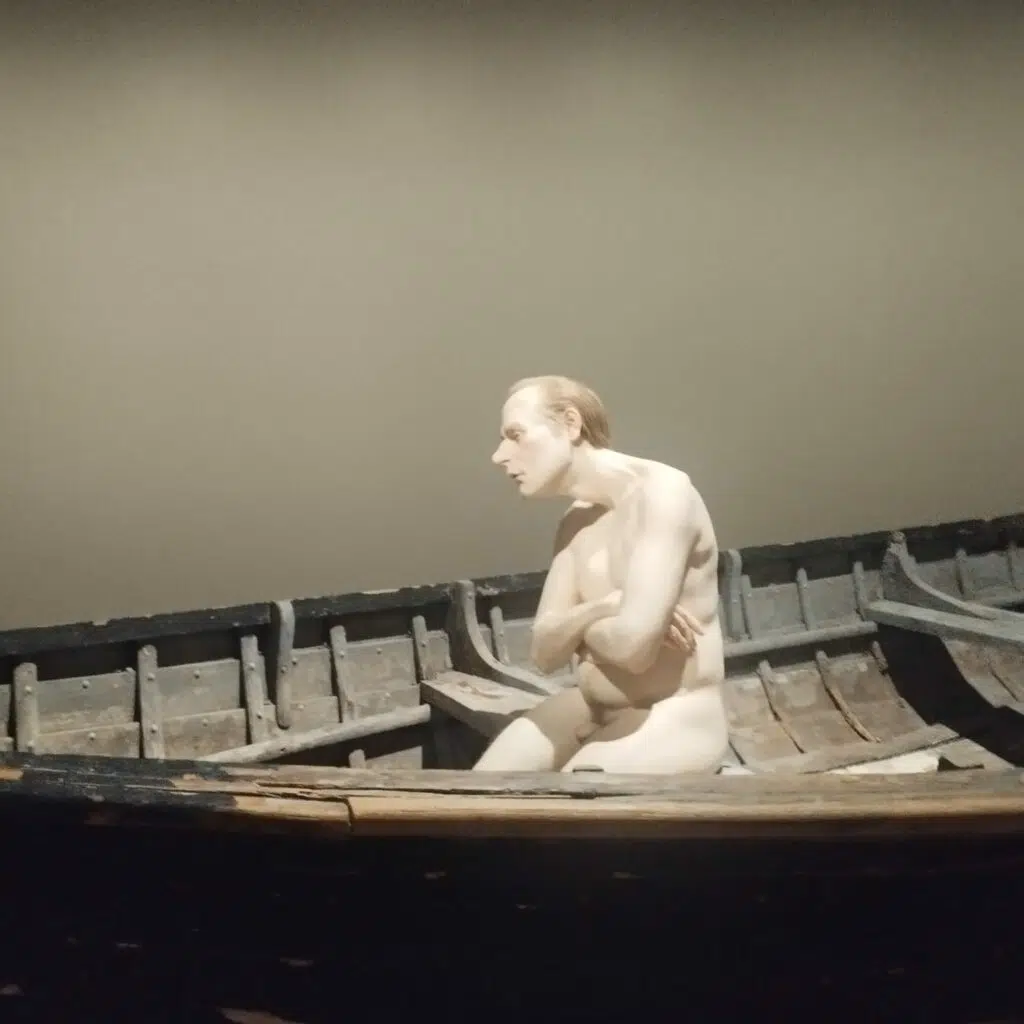 Que regarde cet homme nu, assis dans cette barque? Personne ne le sait vraiment. Entre mélancolie et inquiétude, le visiteur peut créer lui même la trame de l’histoire et répondre aux questions.