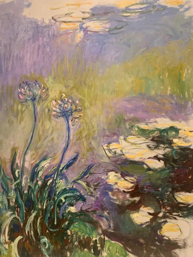 L’Agapanthe, toile presque subliminale, imposante, se nourrit du mauve et vient nous cueillir, tel une fleur d’été. Immense de 13 mètres de long, la peinture a été réalisée sur une période de dix ans. C’est la toile la plus aboutie de Monet, celle qui nous laisse entrevoir de plus près sa technique et les jeux de reflets avec l’eau.