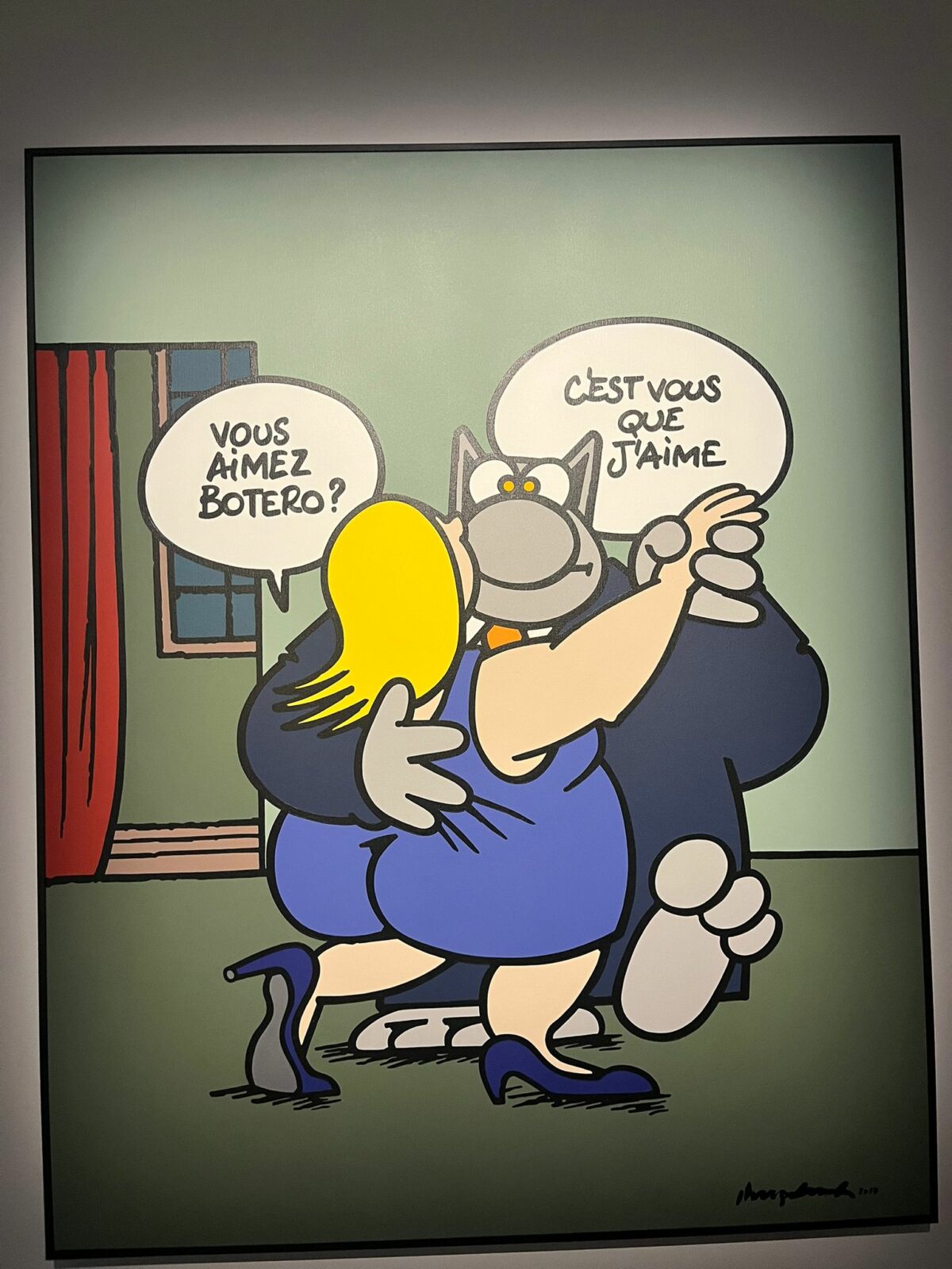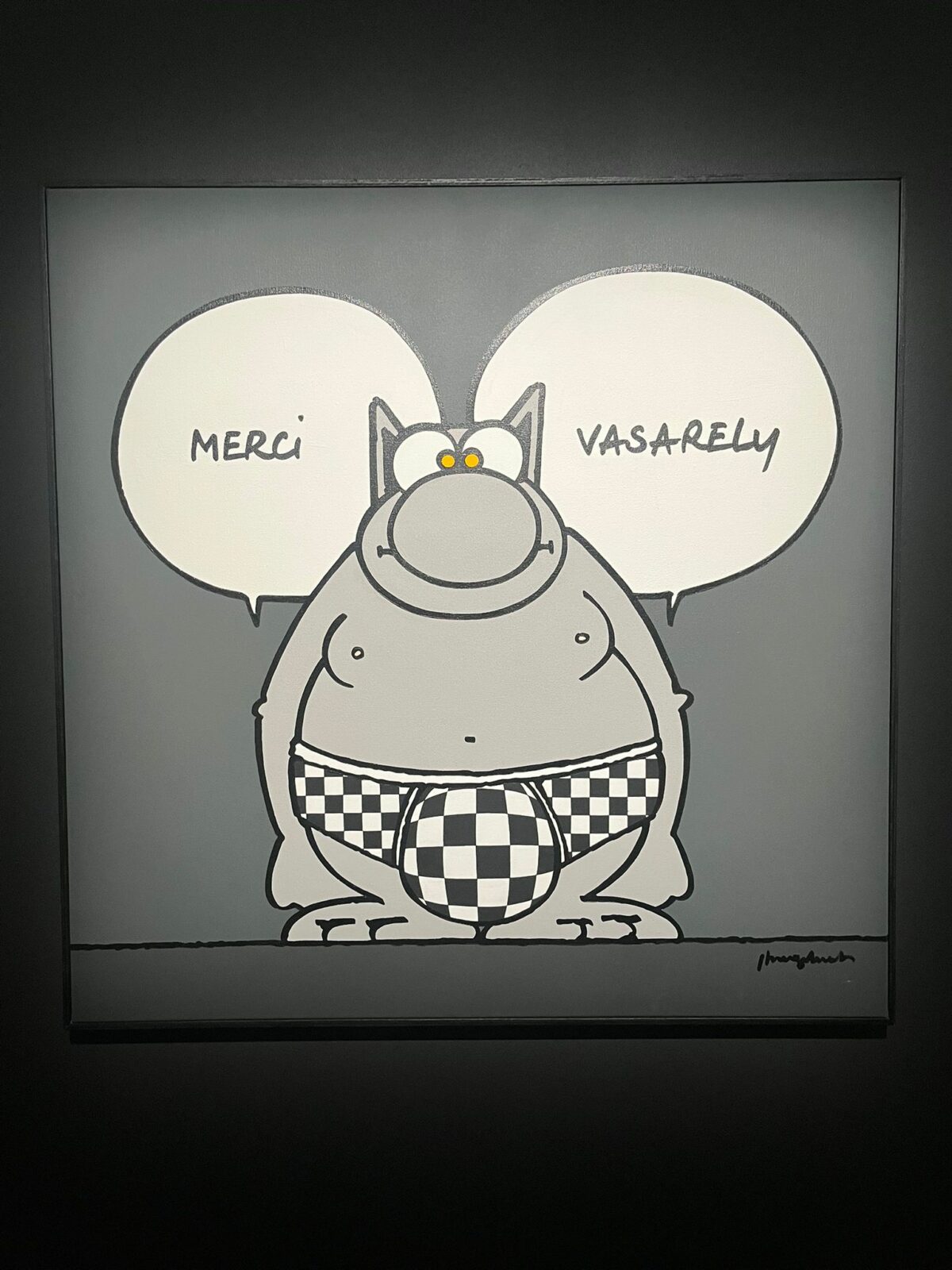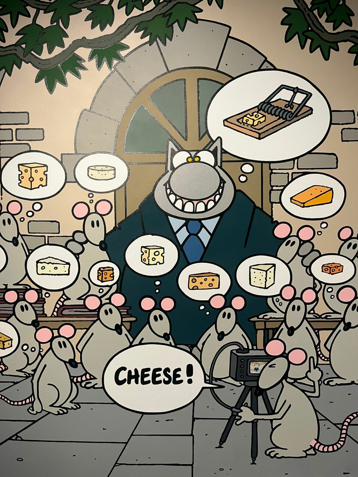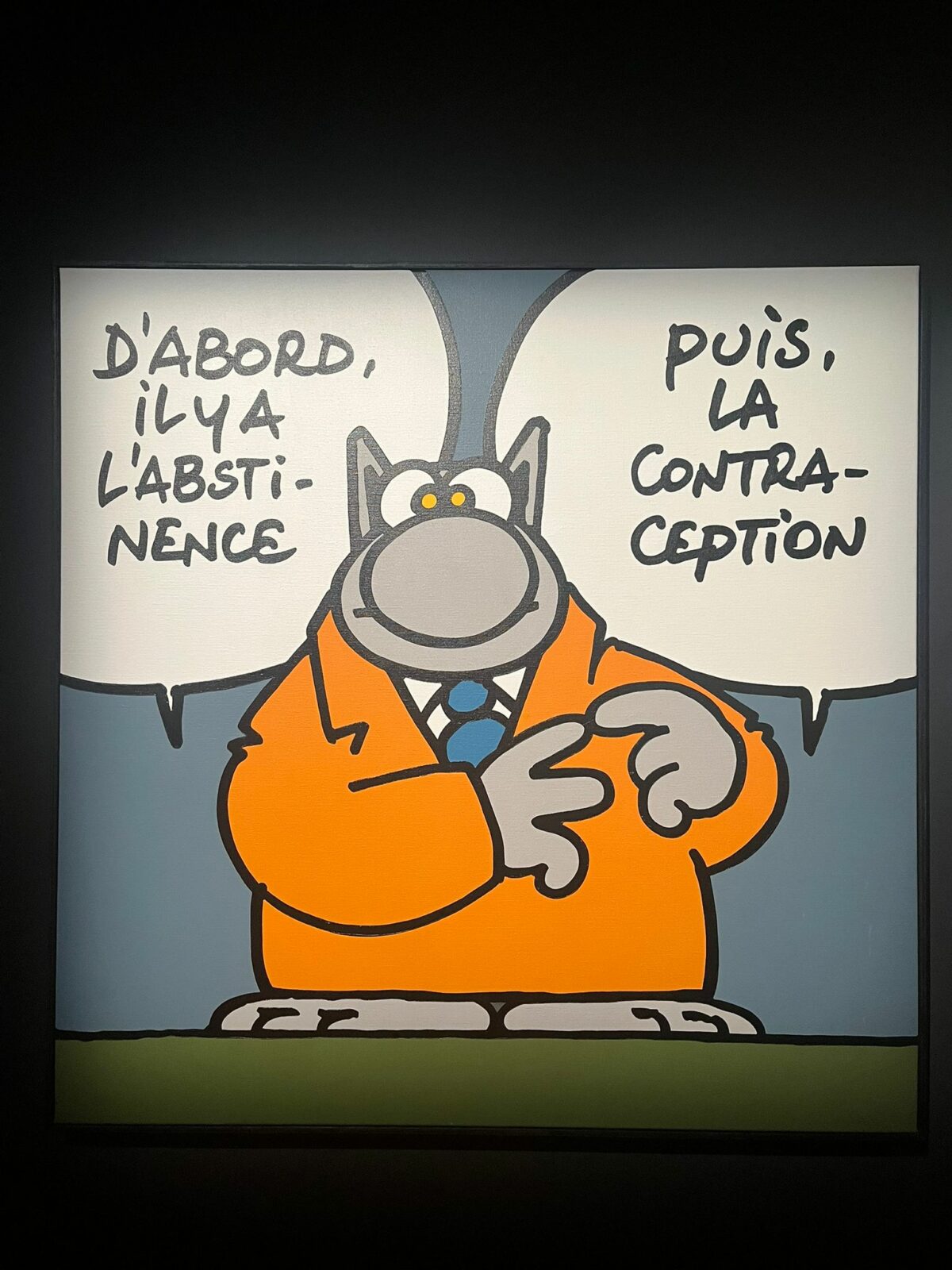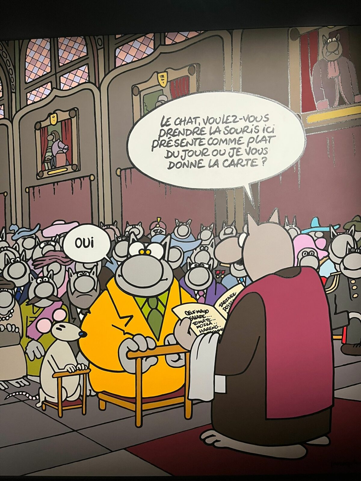 L’un des aspects les plus surprenants de l’exposition est le dialogue que Philippe Geluck établit entre son personnage et les grands maîtres de l’histoire de l’art. Certaines œuvres détournent avec humour des références artistiques célèbres, créant un décalage amusant entre culture classique et humour contemporain.
