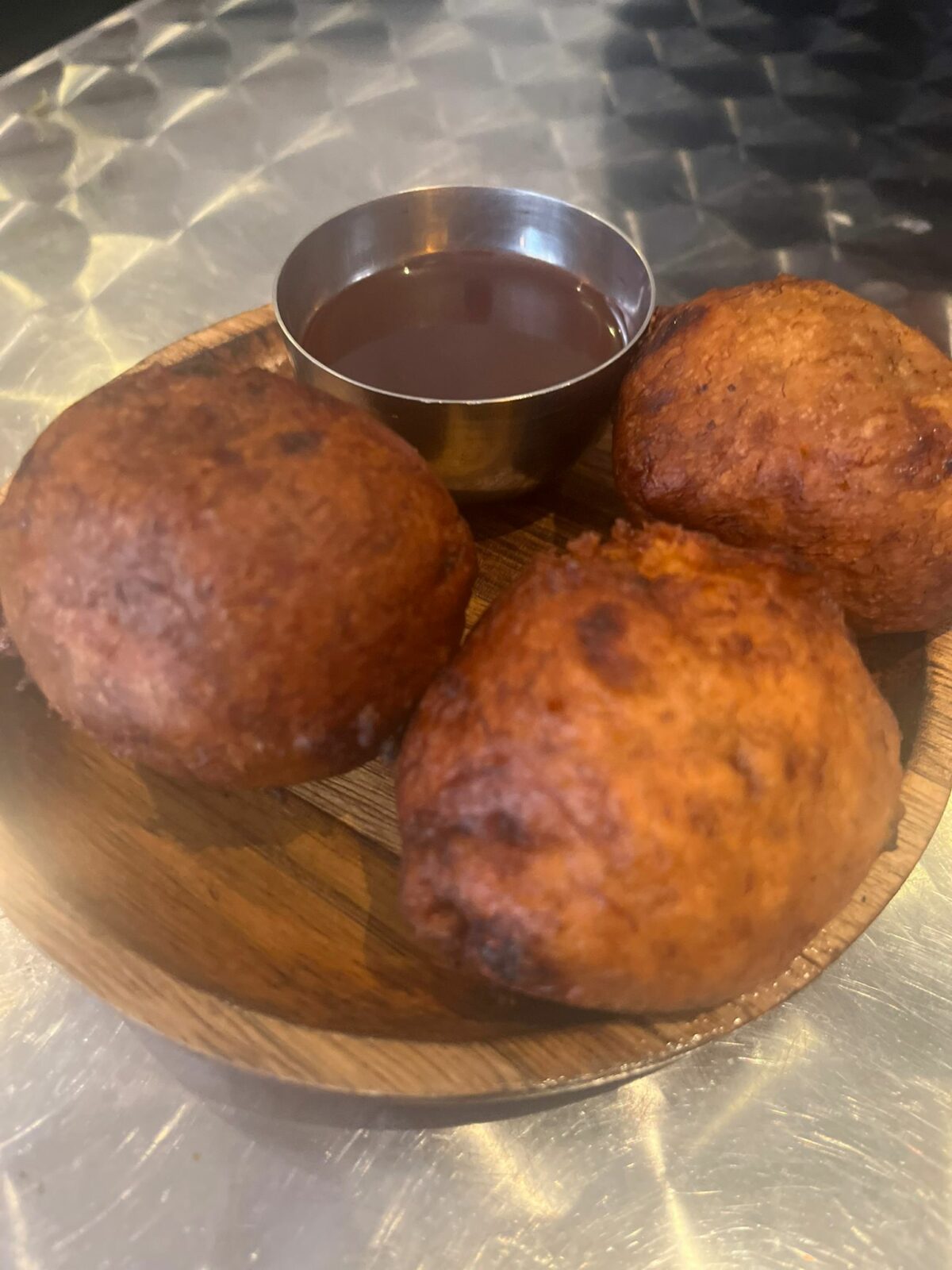 La véritable star du restaurant est sans conteste le masa. Cette petite galette moelleuse est une spécialité très populaire au Nigeria et dans plusieurs pays d’Afrique de l’Ouest. Elle est préparée à partir de riz fermenté, ce qui lui donne une texture aérienne et légèrement acidulée.