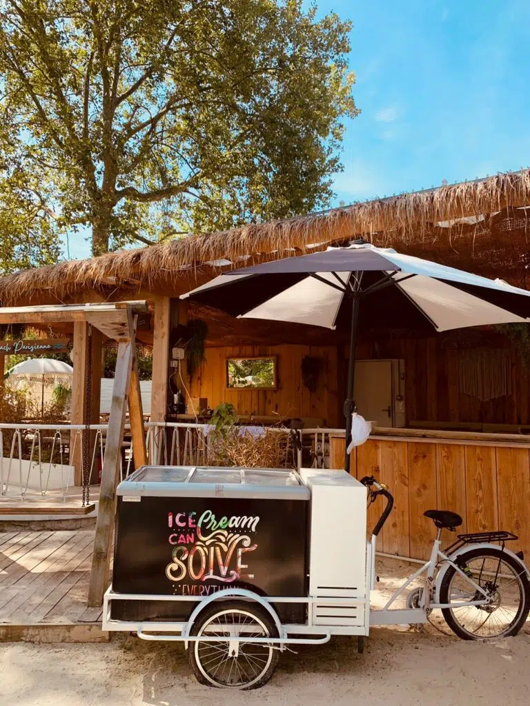 Les enfants jouent au baby foot, les tout petits dans le sable ou sur la balançoire, et les adultes se prélassent autour d’un verre de jus frais. Difficile de croire que le centre de Paris n’est qu’à quelques kilomètres, tant le calme et la légèreté règnent en maître.