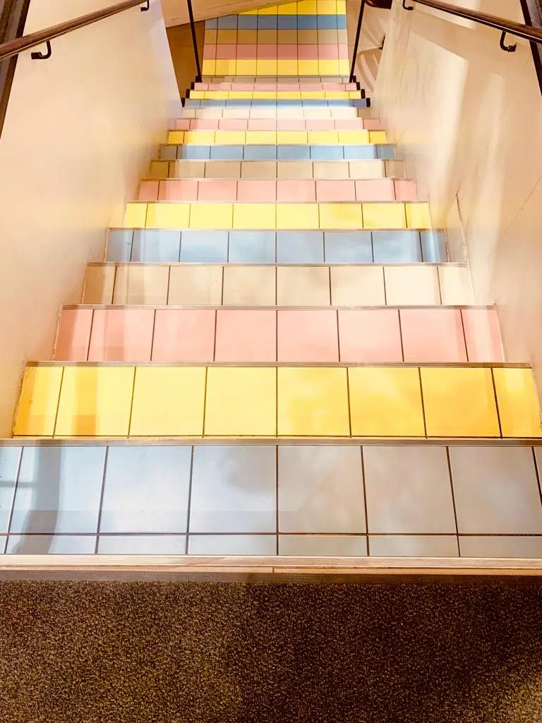 On se croirait presque dans un motel américain en descendant les escaliers avec ses tons pastels, les chaises molletonnées, rappelant ainsi les Etats Unis des années 70.