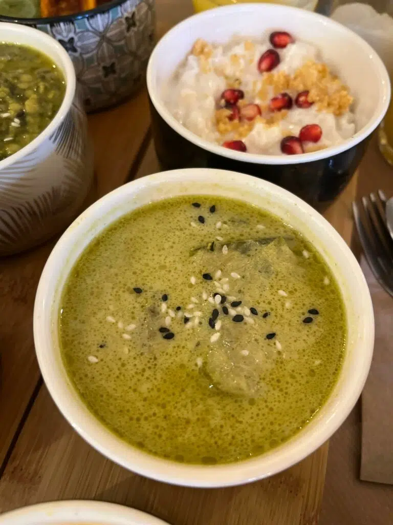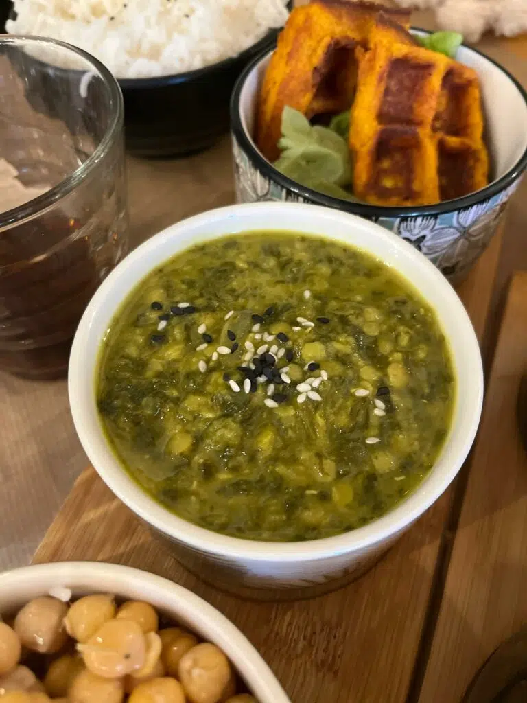 Un dhal aux épinards, réconfortant et riche en protéines végétales, qui offre une texture soyeuse et des saveurs réconfortantes. Ce plat indien classique est épicé avec modération et servi avec du riz basmati, parfait pour équilibrer les épices.