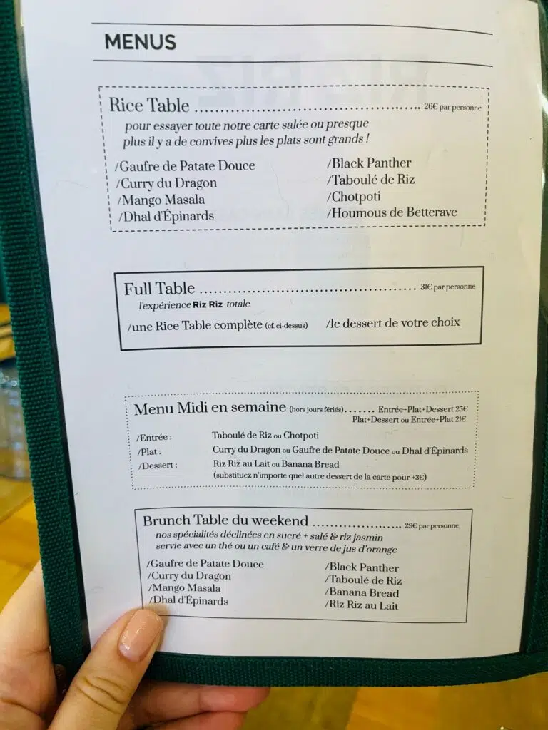 Le brunch Riz Riz se compose de 9 plats succulents, chacun mettant en valeur le riz sous différentes formes et associations de saveurs, le tout dans un esprit végétalien. Voici une description détaillée des plats :