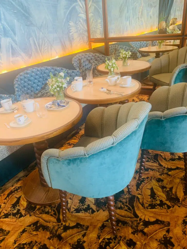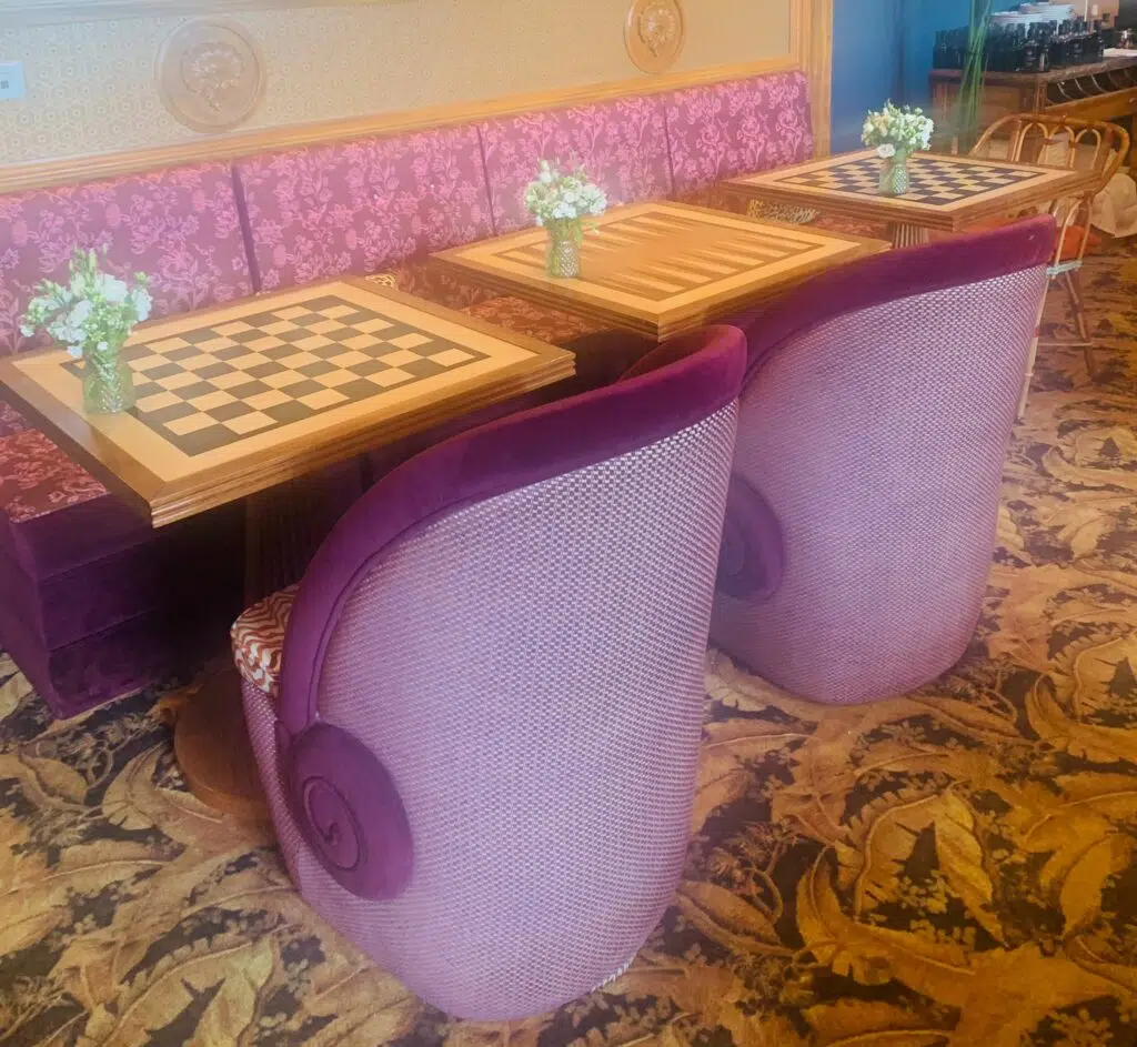 Dans un cadre romanesque, vous trouverez plusieurs salons au cœur du restaurant: le premier salon avec les fauteuils bleu turquoise, en velours. Vous passerez vite au salon d’Orient avec les tables sous forme d’échiquiers et quelques boiseries qui décorent la pièce.