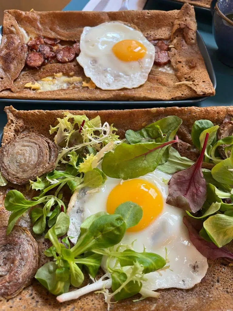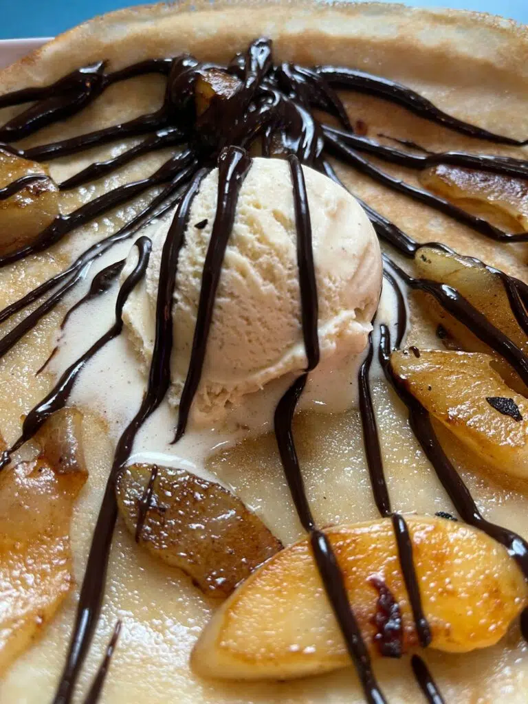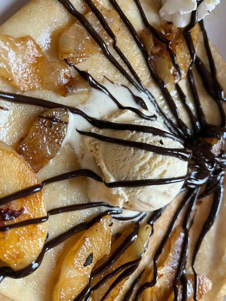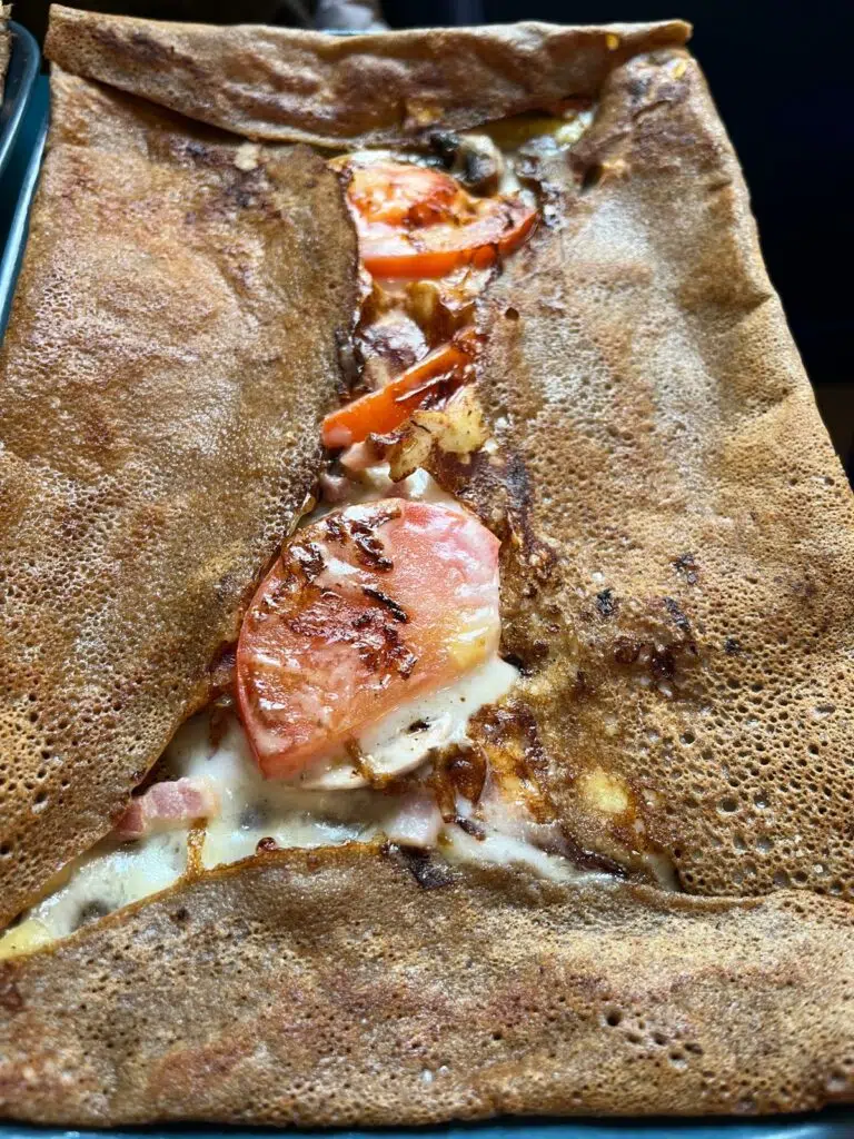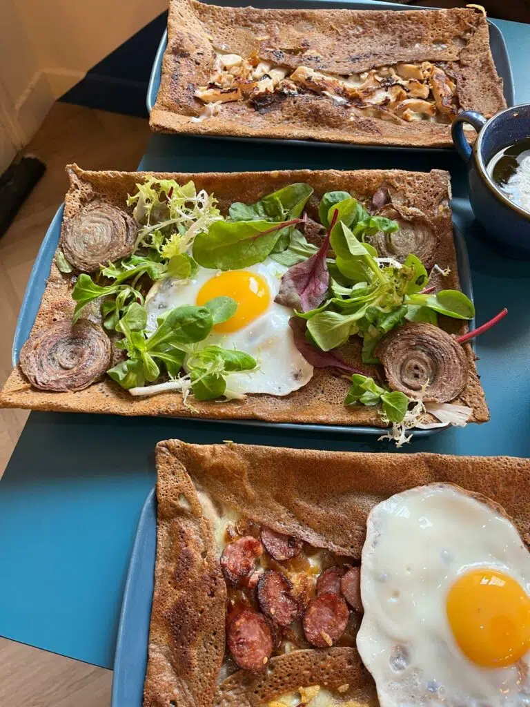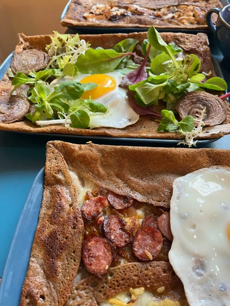 Pour le reste, les prix sont raisonnables. Les galettes commencent autour de 9,50 € et montent jusqu’à 14 € selon la garniture. Parmi les options populaires : la Complète (œuf, jambon, emmental), la Savoyarde (reblochon, pommes de terre, lardons, oignons) ou la Nordique (saumon fumé, crème, citron). Les crêpes sucrées, elles, oscillent entre 6 et 9 €, avec le classique caramel beurre salé maison qui reste une valeur sûre.