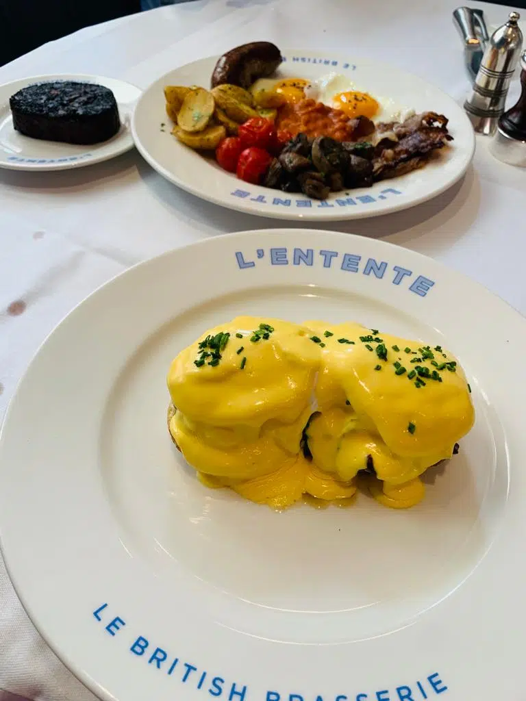 La partie salée ne se fait pas attendre. Nous avons jeté notre dévolu sur « The full l’Entente » avec ses œufs au plat, saucisses, bacon, champignons, tomates, haricots, un vrai plat digne d’un brunch anglais. Nous complétons cette assiette avec des œufs Benedict qui nous mettent en joie. Oliver sait nous réconcilier avec la gastronomie anglaise qui pâtit d’une vision parfois trop stéréotypée.