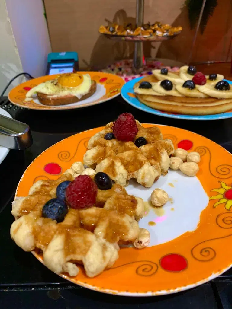 Les choses sérieuses peuvent enfin commencer. Vous irez vous servir parmi les plats présentés: salades, plats chauds, beans, saucisses, saumon. Les viennoiseries et tous types de pain ne manquent pas à l’appel. Laissez-vous tenter par les desserts, aussi bons les uns que les autres. Petite spécialité du chef: un stand de crêpes et gaufres est à votre disposition.