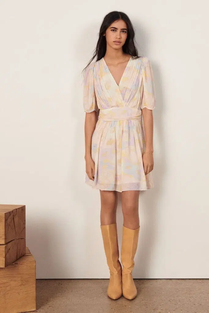 Très belle robe BA&SH, aux couleurs florales qui s’inspire du style baba cool ou Woodstock. Elle est juste magnifique et vous donnera un air de liberté. Robe longue avec une encolure en V, elle est adaptée à la saison et invite au voyage, à l’évasion.