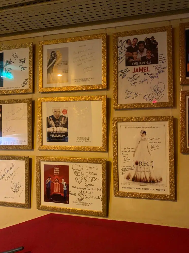 L’entrée des Rex studios débute par quelques affiches de films cultes, dédicacée par les acteurs eux-mêmes dont l’avant première a eu lieu dans la grande salle du cinéma: Astérix et Obélix, La vérité si je mens, la Famille Bélier …