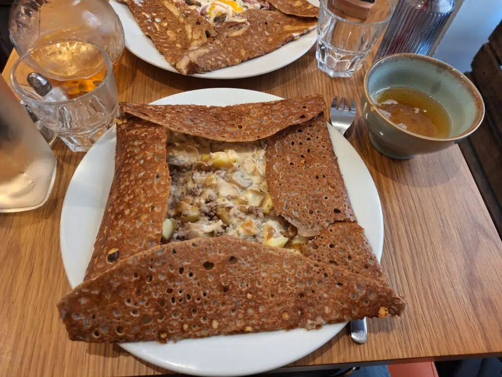 La carte ne cherche pas à être compliquée : ici, tout est dans la qualité des produits et la simplicité des recettes. On retrouve les grands classiques — la galette complète avec jambon, œuf et fromage — mais aussi des versions plus gourmandes :