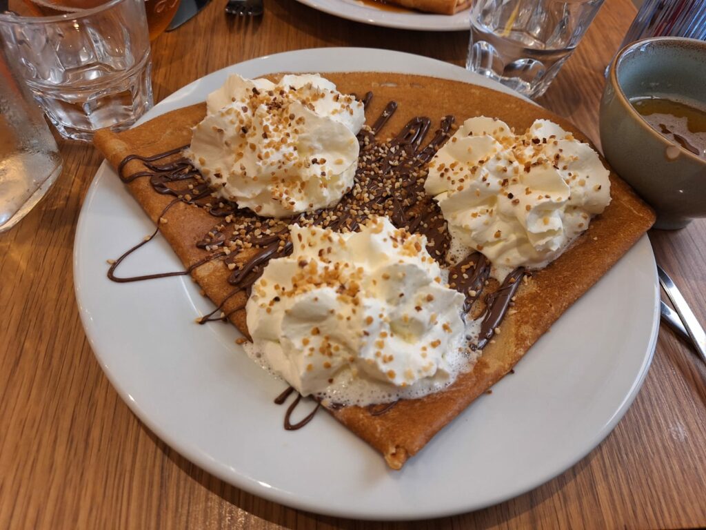 - Et bien sûr, le sucré n’est pas oublié : crêpe au Nutella, miel ou crème de marron, servies bien chaudes, à la texture fine et moelleuse.