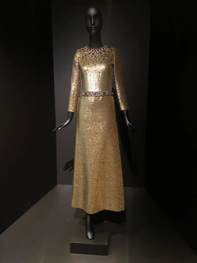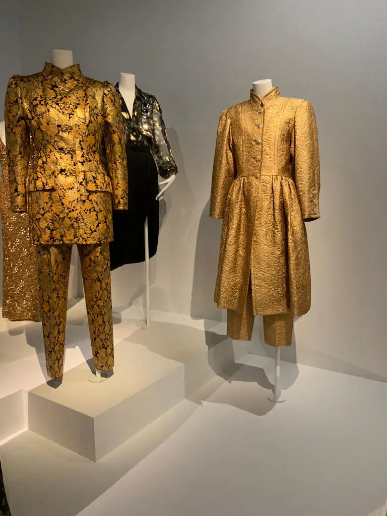 Yves Saint Laurent a toujours été fascinée par les femmes et son objectif ultime était de les sublimer à travers des matières nobles et raffinées. Le doré est aussi une façon de nous montrer son attrait pour le monde de la nuit, des soirées mondaines, organisées par Régine, où les femmes se montrent sous leur meilleur jour. Il a d’ailleurs habillé de nombreuses célébrités, dont Catherine Deneuve.