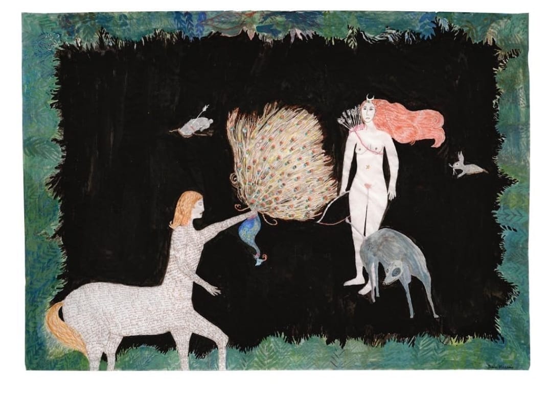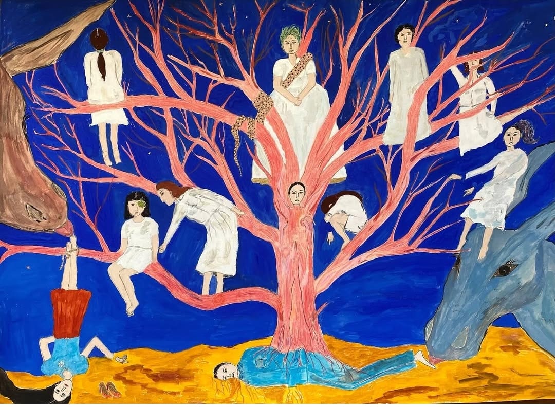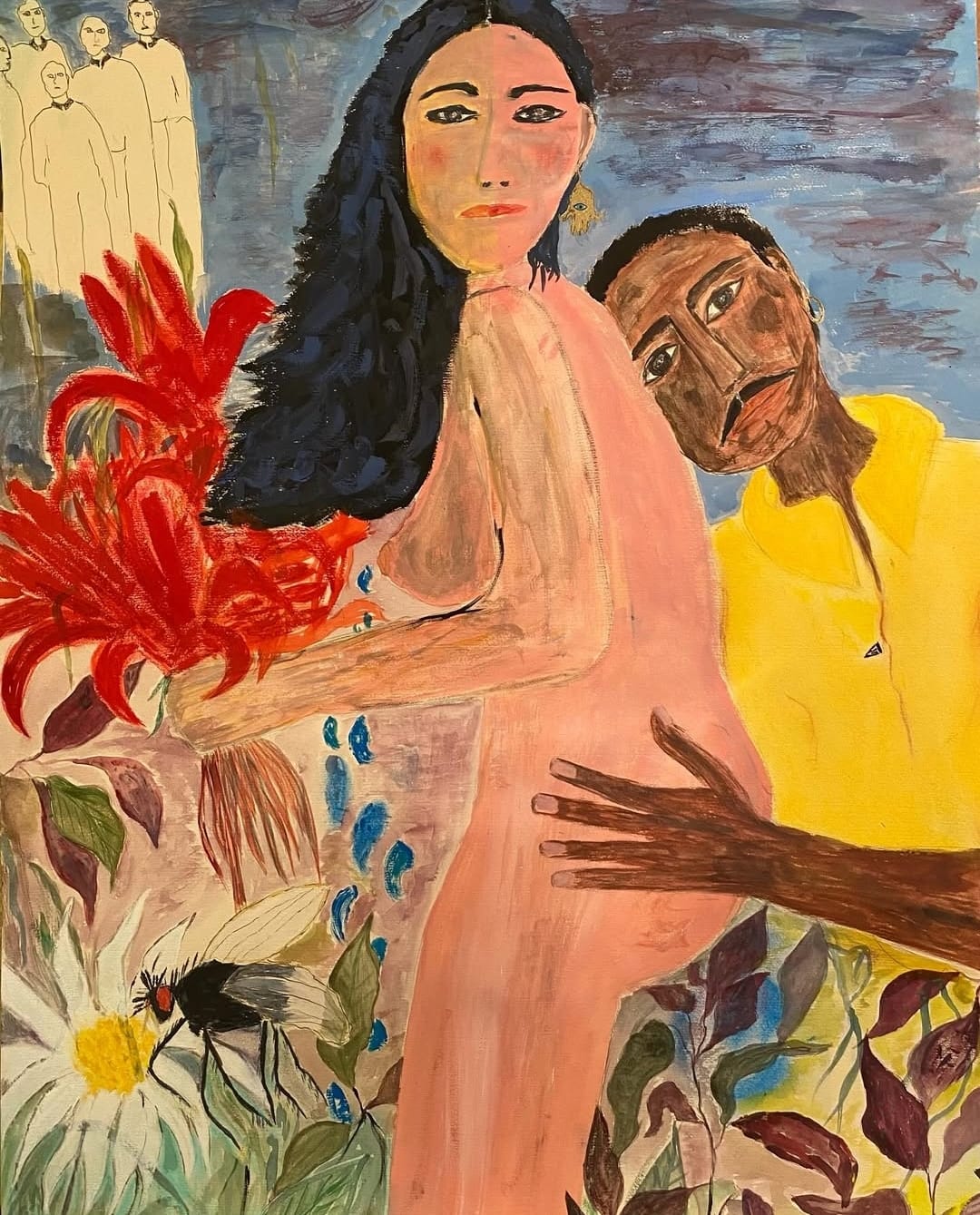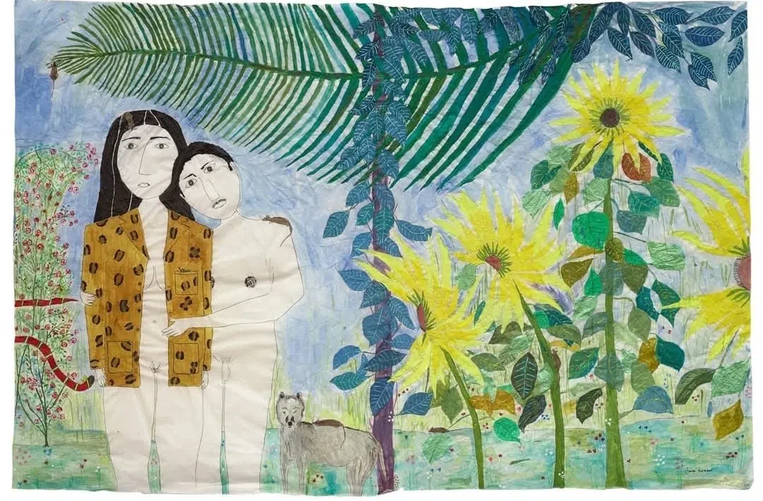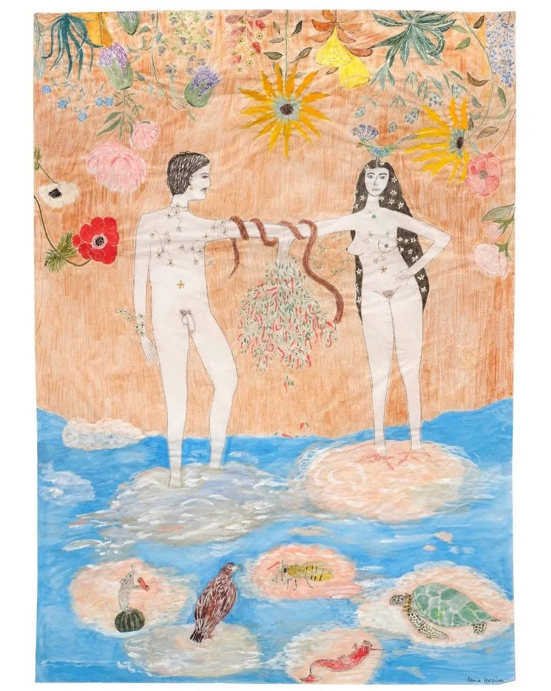 Les personnages de Rania Meziani vivent dehors, au milieu des éléments. Ils vibrent en pleine couleur, dans un paradis qui n’est ni perdu ni retrouvé. Ils passent du jardin au champ, du bois à l’océan, entre ciel et terre.