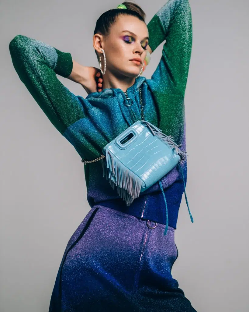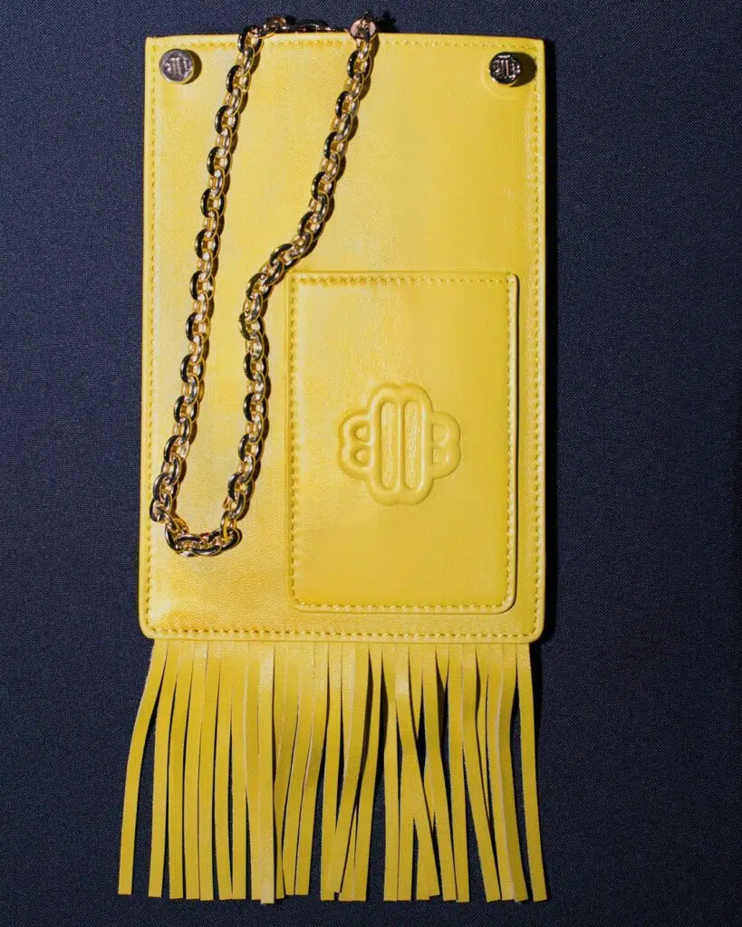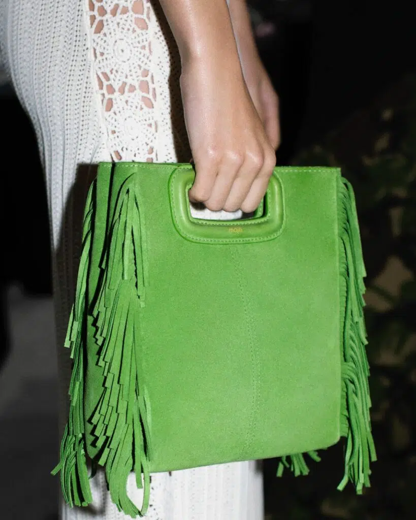 La version mini du célèbre sac Miss Maje. Cuir verni, franges latérales, bandoulière chaîne amovible. Élégant et compact, idéal jour comme nuit.