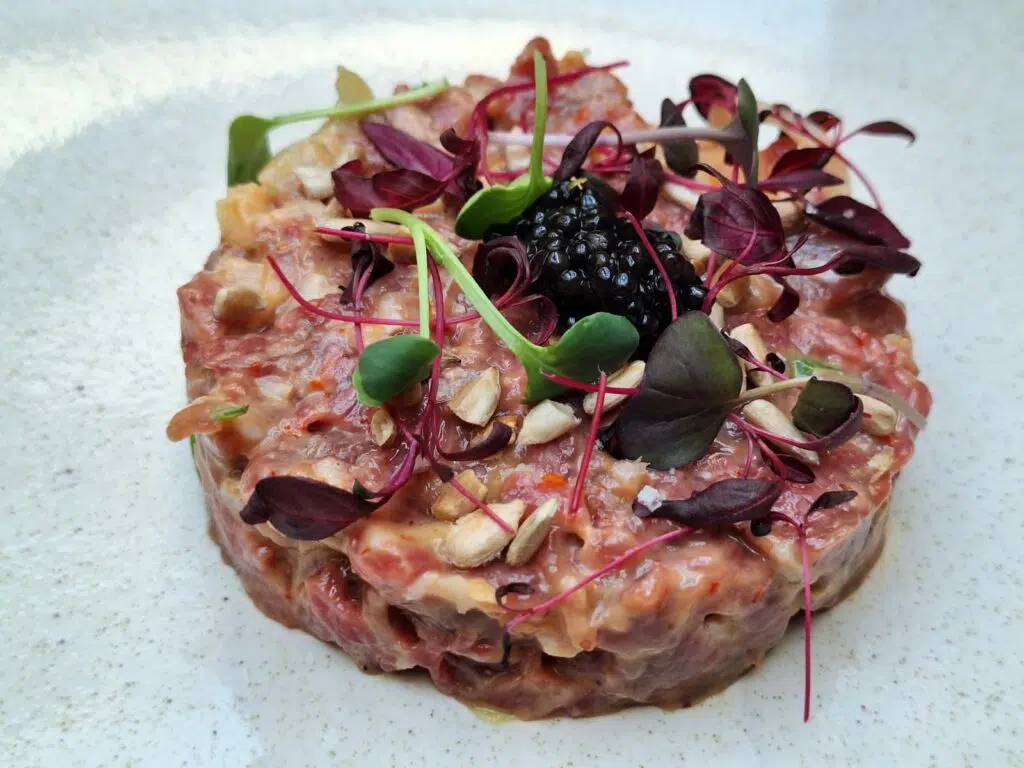 Parmi les assiettes du moment, un tartare de bœuf délicatement relevé au tamarin et rehaussé d’un caviar Osciètre, des tomates de Provence jouant les prolongations d’été avec la framboise et la fleur de sureau, ou encore le thon mariné, aux saveurs franches. Chaque plat raconte une histoire, sans jamais sombrer dans le bavardage culinaire.