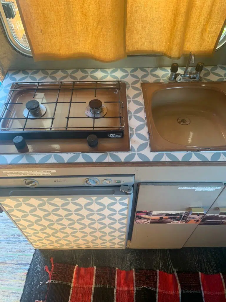 Côté cuisine, c’est très ergonomique: gazinière, mini frigo, lavabo et placards avec ustensiles, se trouvent à votre disposition. C’est vraiment bien pensé car le moindre recoin est utilisé pour y ranger tout le nécessaire.